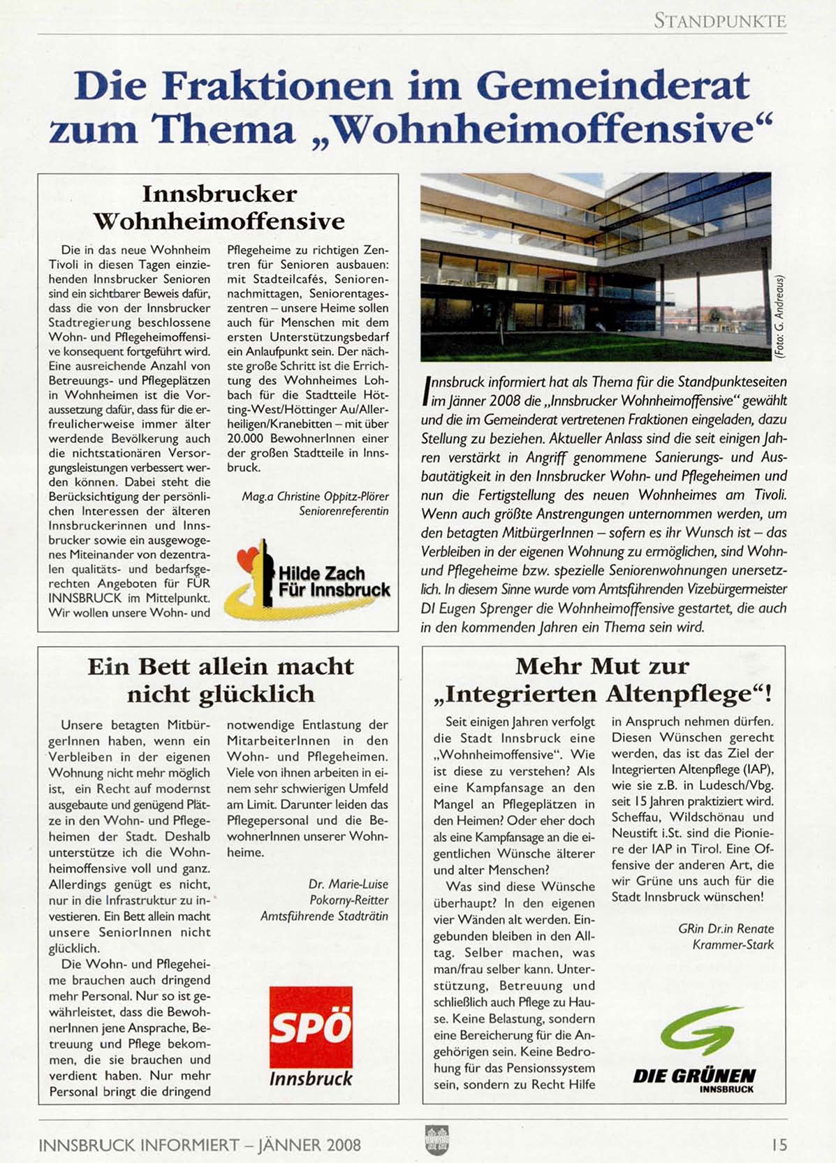Stellung zu beziehen. Aktueller Anlass sind die seit einigen Jahren verstärkt in Angriff genommene Sanierungs- und Ausbautätigkeit in den Innsbrucker Wohn- und Pflegeheimen und