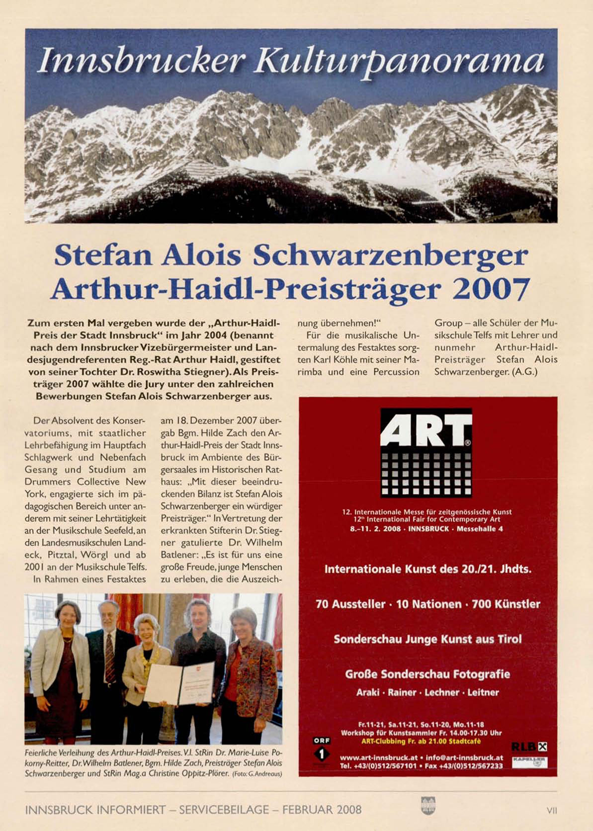 am 18. Dezember 2007 übergab Bgm. Hilde Zach den Arthur-Haidl-Preis der Stadt Innsbruck im Ambiente des Bürgersaales im Historischen Rathaus: „ M i t dieser beeindruckenden Bilanz ist Stefan Alois