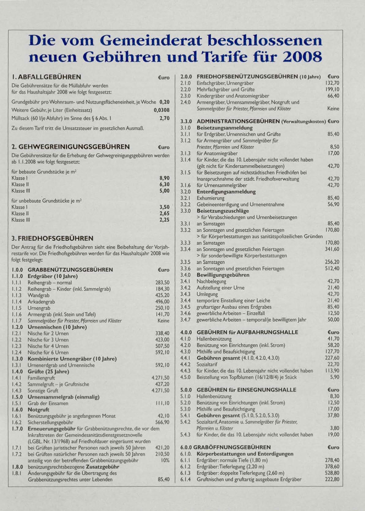 Der Antrag für die Friedhofsgebühren sieht eine Beibehaltung der Vorjahrestarife vor. Die Friedhofsgebühren werden für das Haushaltsjahr 2008 wie