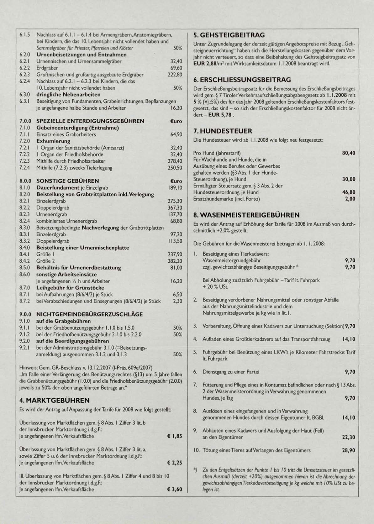 Die Gebühren für die Wasenmeisterei betragen ab I. I. 2008: