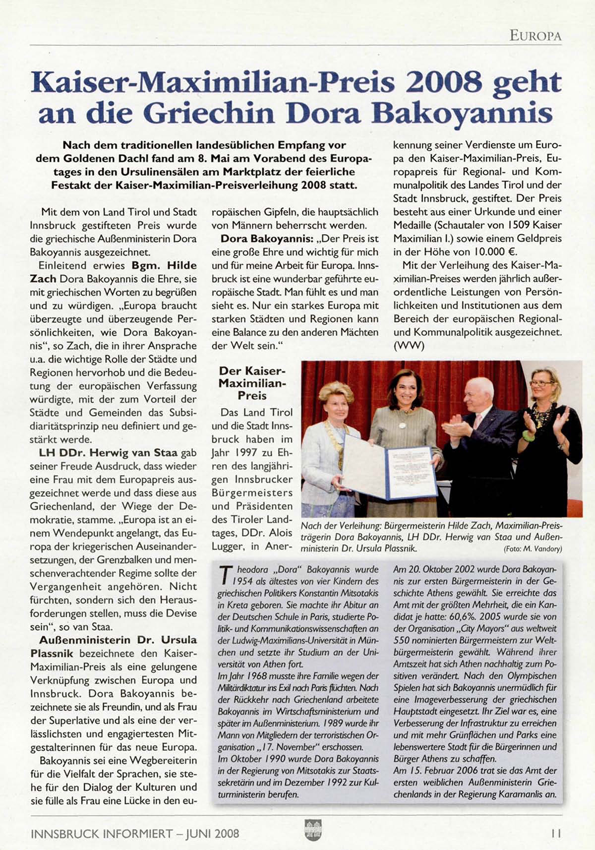 kennung seiner Verdienste um Europa den Kaiser-Maximilian-Preis, Europapreis für Regional- und K o m munalpolitik des Landes Tirol und der