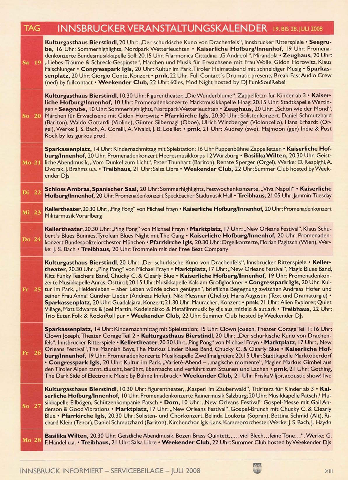 K e l l e r t h e a t e r , 20.30 Uhr: „Ping Pong" von Michael Frayn • M a r k t p l a t z , 17 U h r : „ N e w Orleans Festival", Klaus Schubert"s Blues Bunnies,Tyrolean Blues Night mit The Gang • K a i s e r l i c h e H o f b u r g / I n n e n h o f , 20 Uhr: Promenadenkonzert Bundespolizeiorchester München • P f a r r k i r c h e Igls, 20.30 Uhr: Orgelkonzerte, Florian Pagitsch (Wien), Werke: J. S. Bach • T r e i b h a u s , 20 U h r T r o m m e l n mit der Free Beat Company