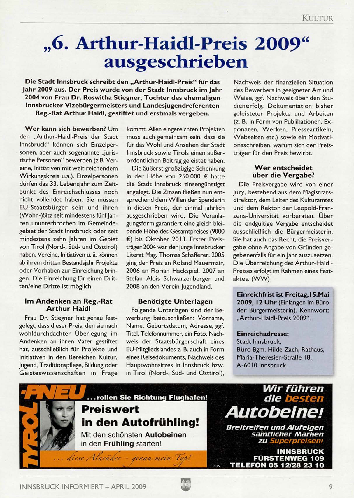D i e S t a d t I n n s b r u c k s c h r e i b t d e n „ A r t h u r - H a i d l - P r e i s " f ü r das