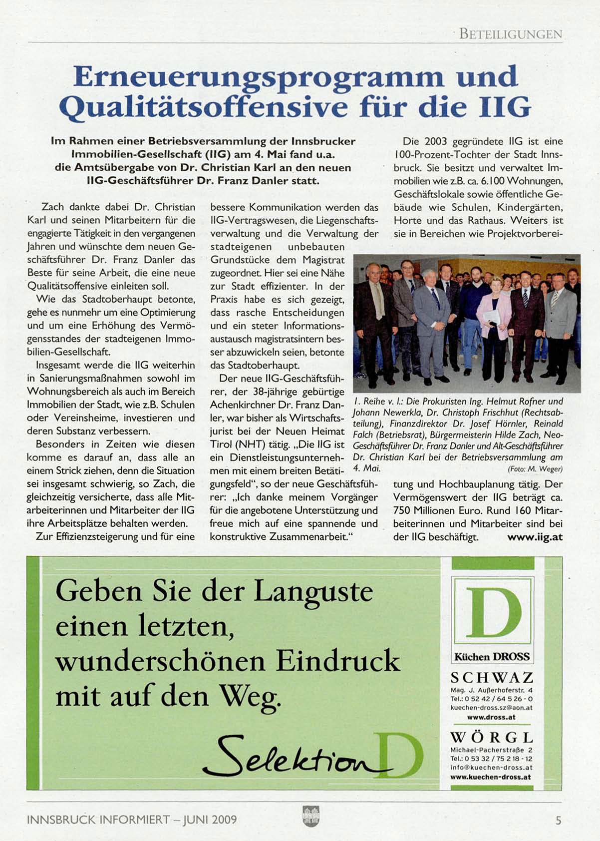 jurist bei der Neuen Heimat Falch (Betriebsrat), Bürgermeisterin Hilde Zach, NeoTirol (NHT) tätig. „Die IIG ist Geschäftsführer Dr. Franz Danler und Alt-Geschäftsführer