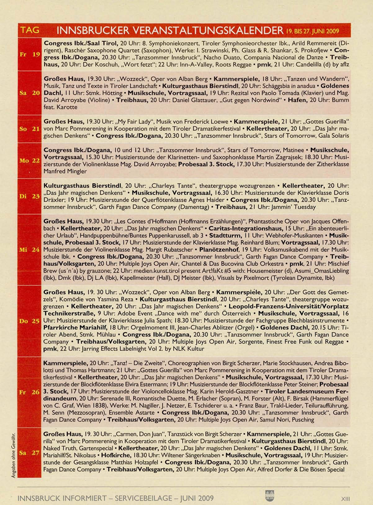 INNSBRUCKER VERANSTALTUNGSKALENDER ,9. Bis 27. juN, 2009