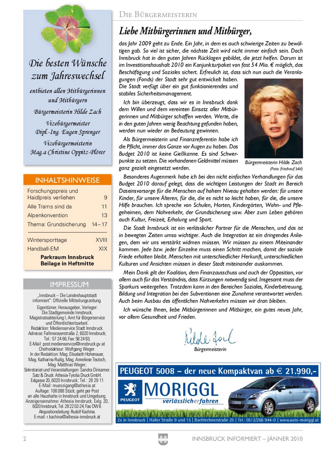 das jahr 2009 geht zu Ende. Ein jahr, in dem es auch schwierige Zeiten zu bewältigen gab. So viel ist sicher, die nächste Zeit wird nicht immer einfach sein. Doch Innsbruck hot in den guten Jahren Rücklagen gebildet, die jetzt heifen. Darum ist im Investitionshaushalt 2010 ein Konjunkturpaket von fast 54 Mio. & möglich, das Beschäftigung und Soziales sichert. Erfreulich ist, dass sich nun