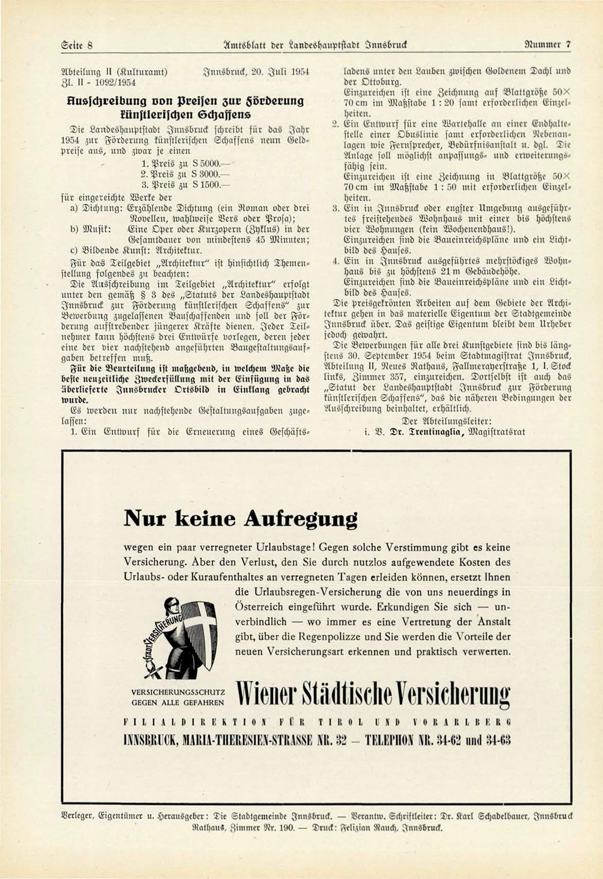 Die Bewerbungen für alle drei ^unstgebicte sind bis längstens 30. September 1954 beim Stadtmagistrat Iuusbruck,