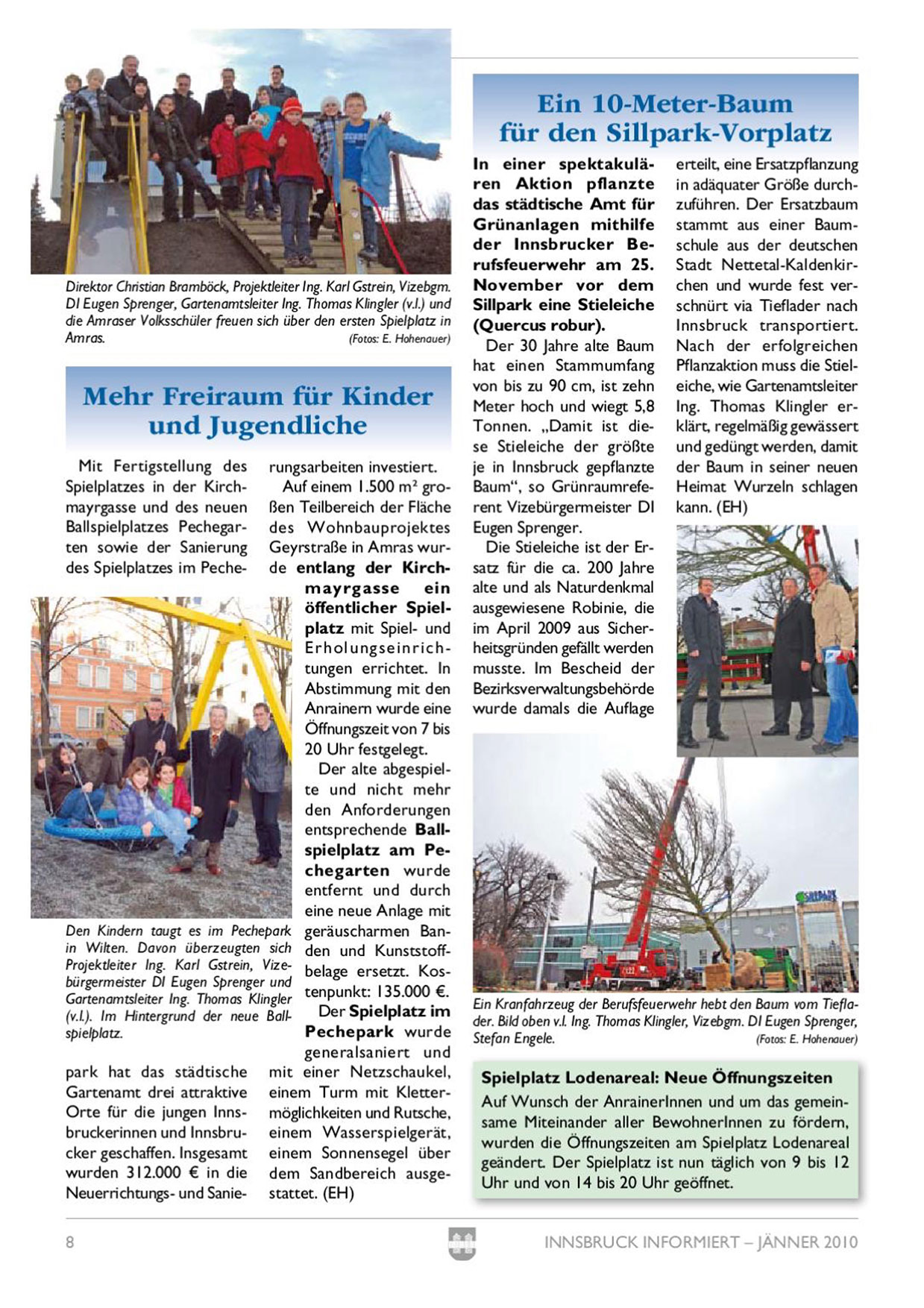 erteilt, eine Ersatzpflanzung in adäquater Größe durchzuführen. Der Ersatzbaum stammt aus einer Baumschule aus der deutschen Stadt Nettetal-Kaldenkirchen und wurde fest verschnürt via Tieflader nach Innsbruck transportiert. Nach der erfolgreichen Pflanzaktion muss die Stieleiche, wie Gartenamtsleiter Ing. Thomas Klingler erklärt, regelmäßig gewässert und gedüngt werden, damit