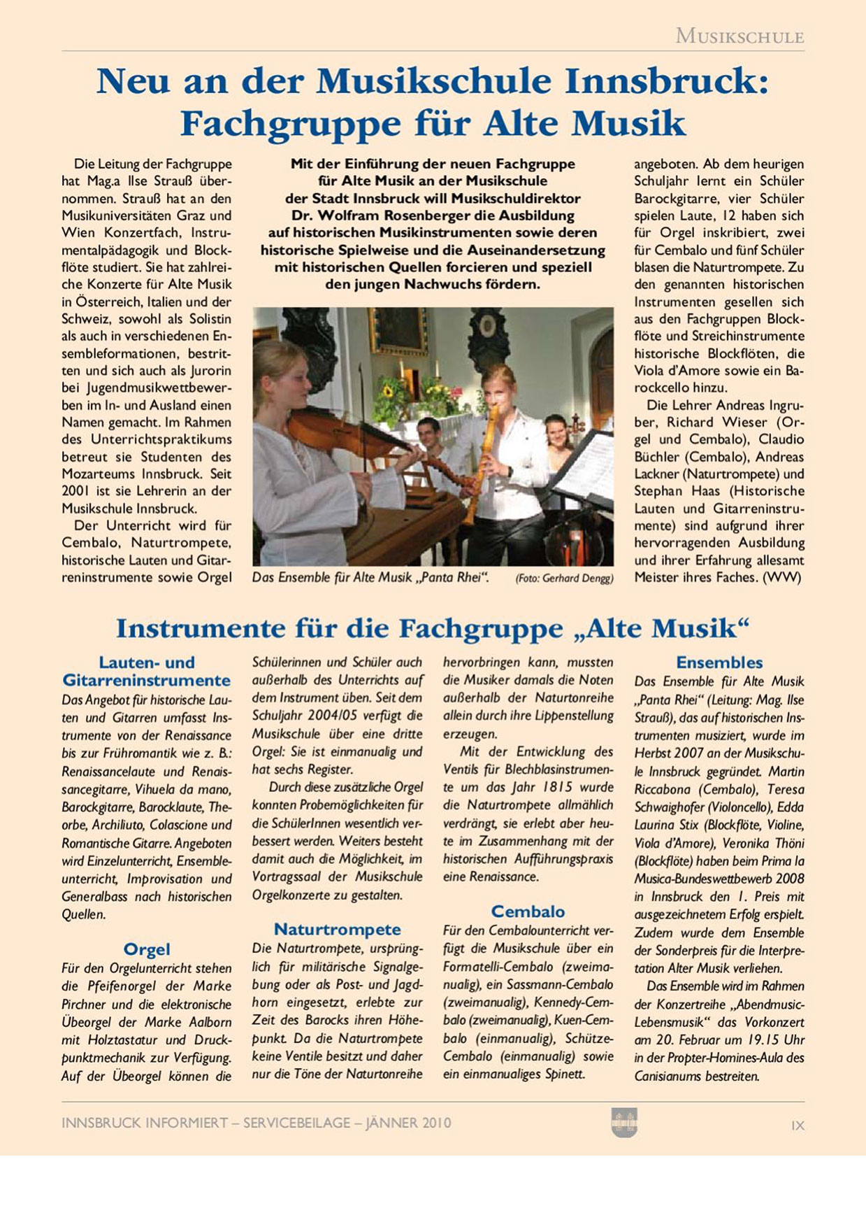 Das Ensembie für Alte Musik „Panto Rhei“ (Leitung: Mag. lIse Strauß), das auf historischen Instrumenten musiziert, wurde im Herbst 2007 an der Musikschule Innsbruck gegründet. Martin Riccobona (Cembalo), Tereso Schwoighofer (Violoncello), Edda Laurina Stix (Blockflöte, Violine, Violo d"Amore), Veroniko Thöni (Blockflôte) haben beim Prima lo Musico-Bundeswettbewerb 2008 in