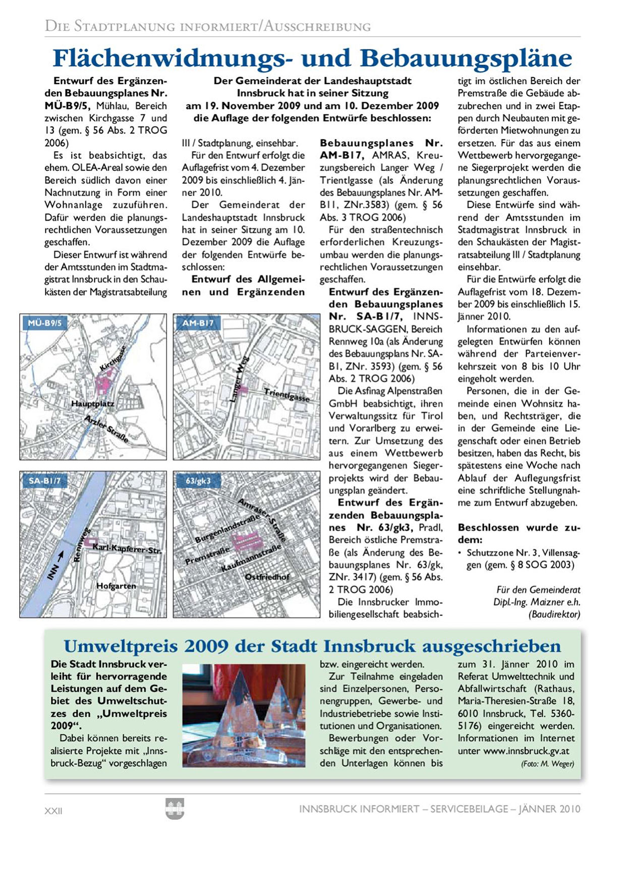 Der Gemeinderat der Landeshauptstadt Innsbruck hat in seiner Sitzung am 19. November 2009 und am 10. Dezember 2009 die Auflage der folgenden Entwürfe beschlossen: