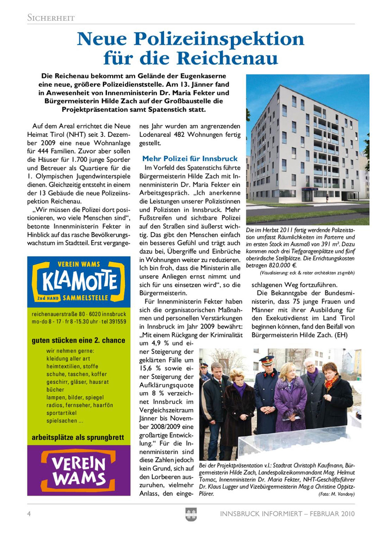 Die Reichenau bekommt am Gelände der Eugenkaserne eine neue, größere Polizeidienststelle. Am 13. Jänner fand in Anwesenheit von Innenministerin Dr. Maria Fekter und Bürgermeisterin Hilde Zach auf der Großbaustelle die Projektpräsentation samt Spatenstich statt.
