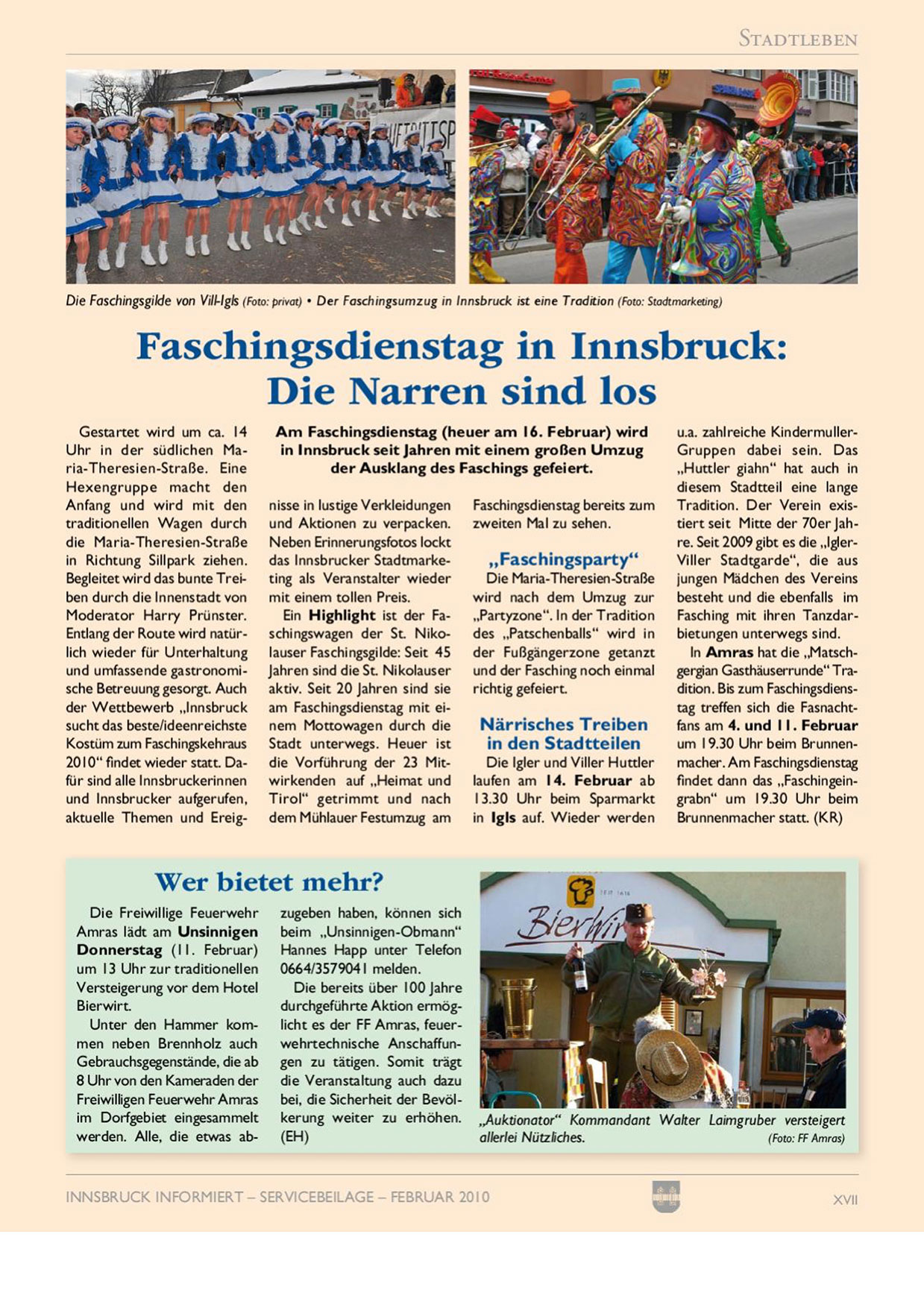 Betreuung gesorgt. Auch der Wettbewerb „Innsbruck sucht das bestelideenreichste Kostüm zum Faschingskehraus 2010“ findet wieder statt. Dafür sind alle Innsbruckerinnen und Innsbrucker aufgerufen, aktuelle Themen und Ereig