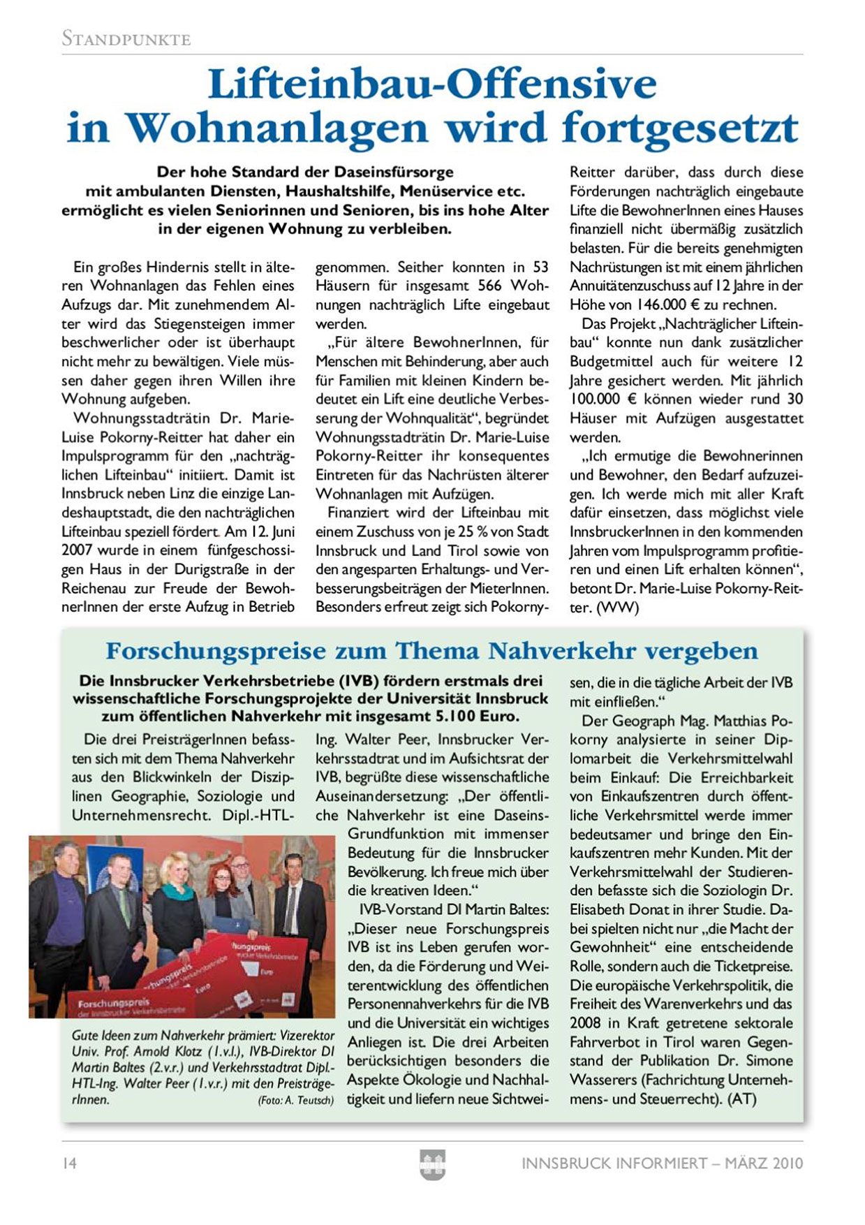 Wohnungsstadträtin Dr. MarieLuise Pokorny-Reitter hat daher ein Impulsprogramm für den „nachträglichen Lifteinbau“ initüert. Damit ist Innsbruck neben Linz die einzige Landeshauptstadt, die den nachträglichen Lifteinbau speziell fördert. Am 12. Juni 2007 wurde in einem fünfgeschossigen Haus in der
