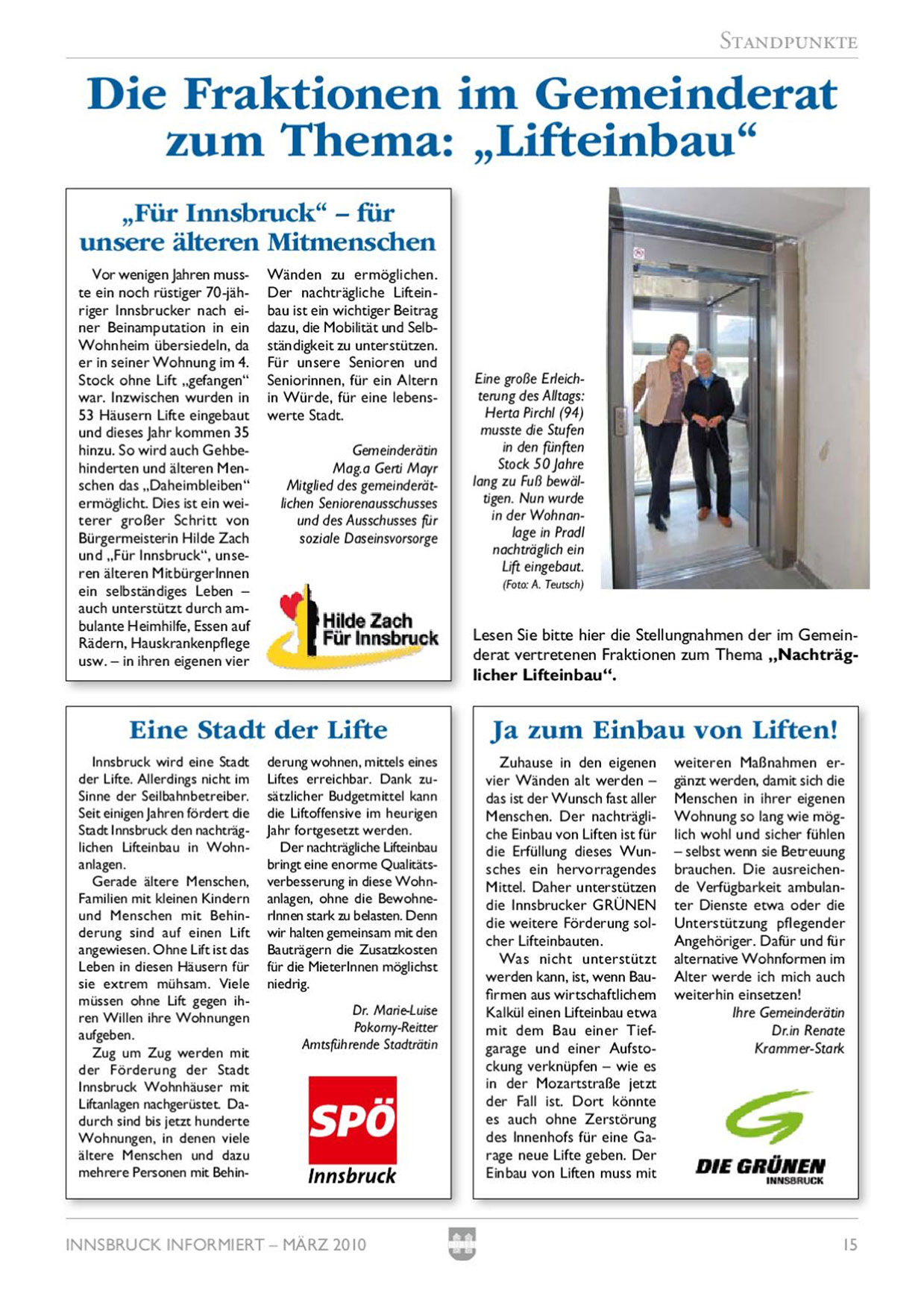 älteren Menschen das „Daheimbleiben“ ermöglicht. Dies ist ein weiterer großer Schritt von Bürgermeisterin Hilde Zach und „Für Innsbruck“, unseren älteren Mitbürgerinnen ein selbständiges Leben — auch unterstützt durch ambulante Heimhilfe, Essen auf Rädern, Hauskrankenpflege usw. — in ihren eigenen