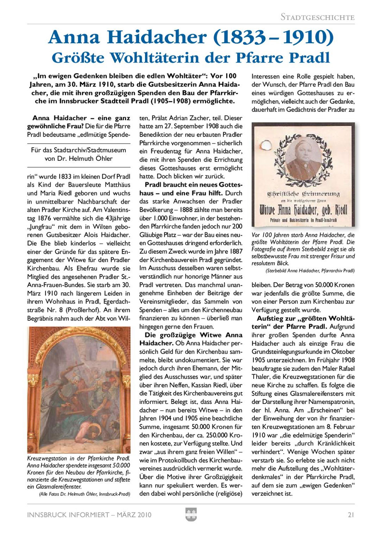 Aufstieg zur „größten Wohltäterin“ der Pfarre Pradl. Aufgrund ihrer großen Spenden durfte Anna Haidacher auch als einzige Frau die Grundsteinlegungsurkunde im Oktober 1905 unterzeichnen. Im Frühjahr 1908 beauftragte sie zudem den Maler Rafael Thaler, die Kreuzwegstationen für die neue Kirche zu