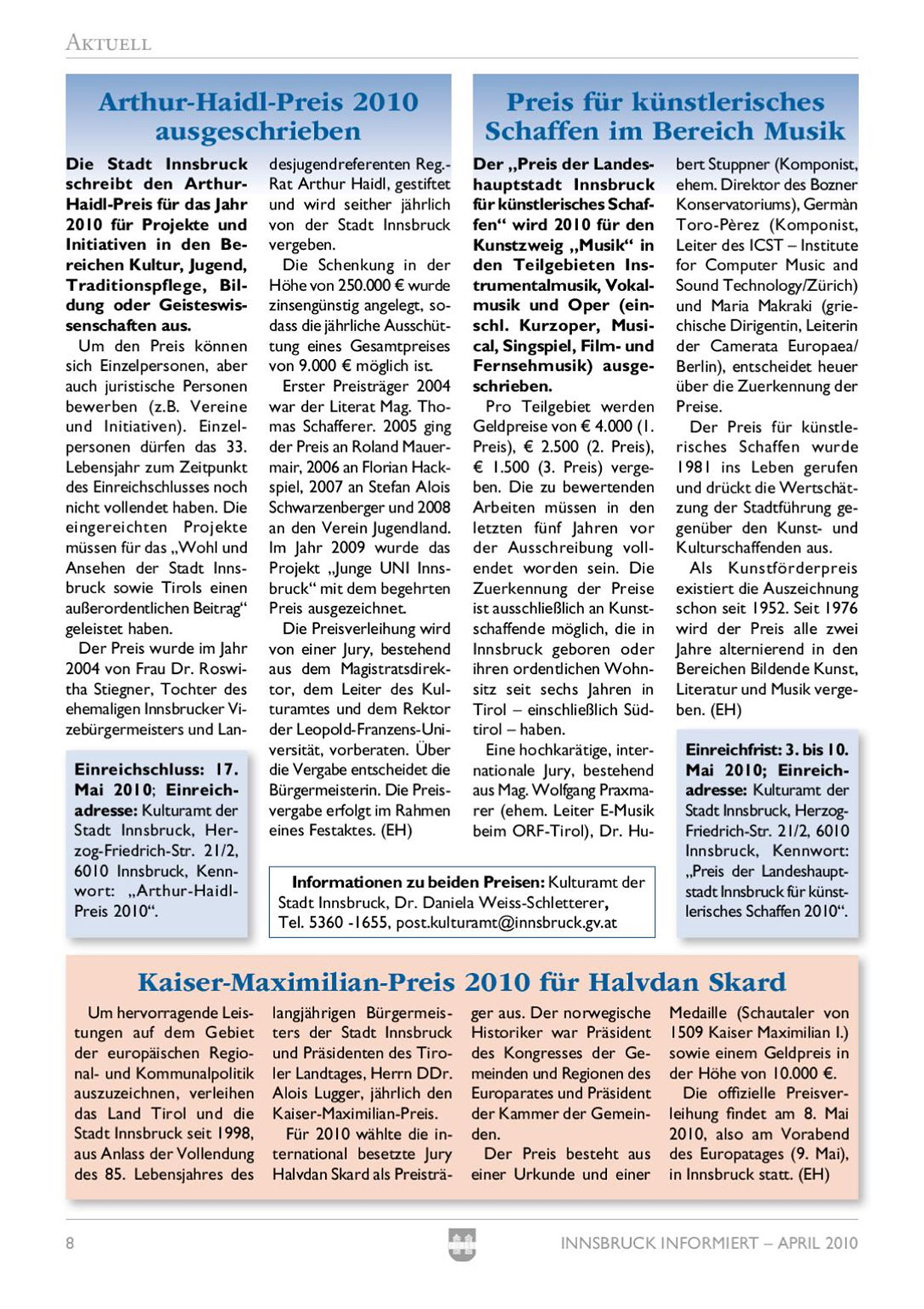 Einreichschluss: 17. Mai 2010: Einreichadresse: Kulturamt der Stadt Innsbruck, Herzog-Friedrich-Str. 21/2, 6010 Innsbruck, Kennwort: „Arthur-HaidlPreis 2010“