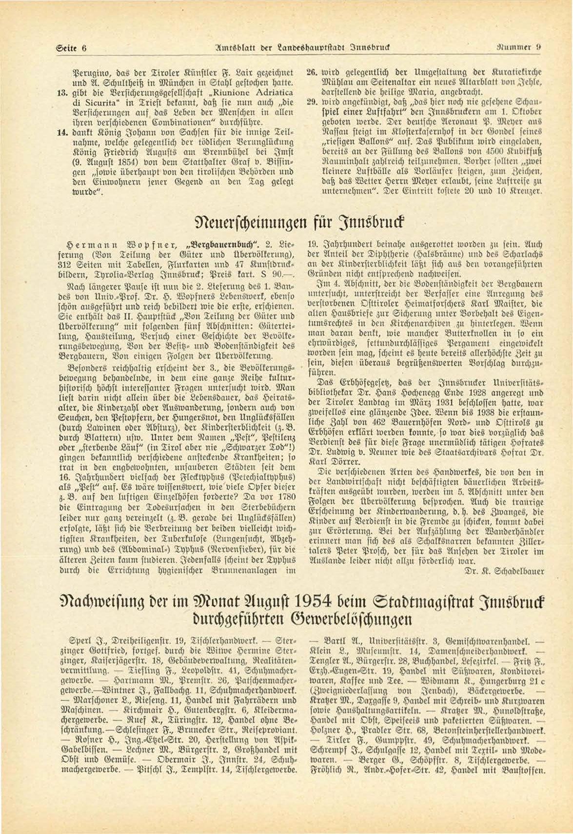 Nachweisung der im Monat August 1954 beim Stadtmagisttat Innsbruck