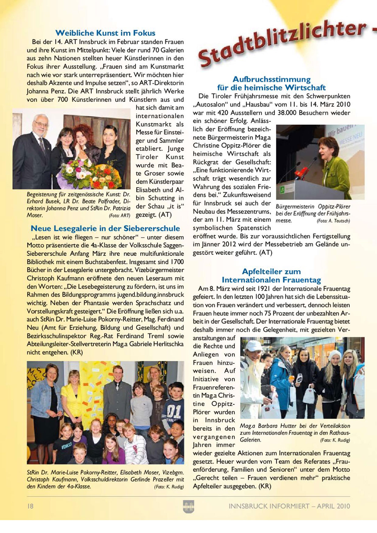 Aufbruchsstimmung für die heimische Wirtschaft Die Tiroler Frühjahrsmesse mit den Schwerpunkten „Autosalon“ und „Hausbau“ vom 11. bis 14. März 2010 war mit 420 Ausstellern und 38.000 Besuchern wieder ein schöner Erfolg. Anlässlich der Eröffnung bezeichnete Bürgermeisterin Mag.a Christine OppitzPlörer die heimische Wirtschaft als Rückgrat der Gesellschaft: