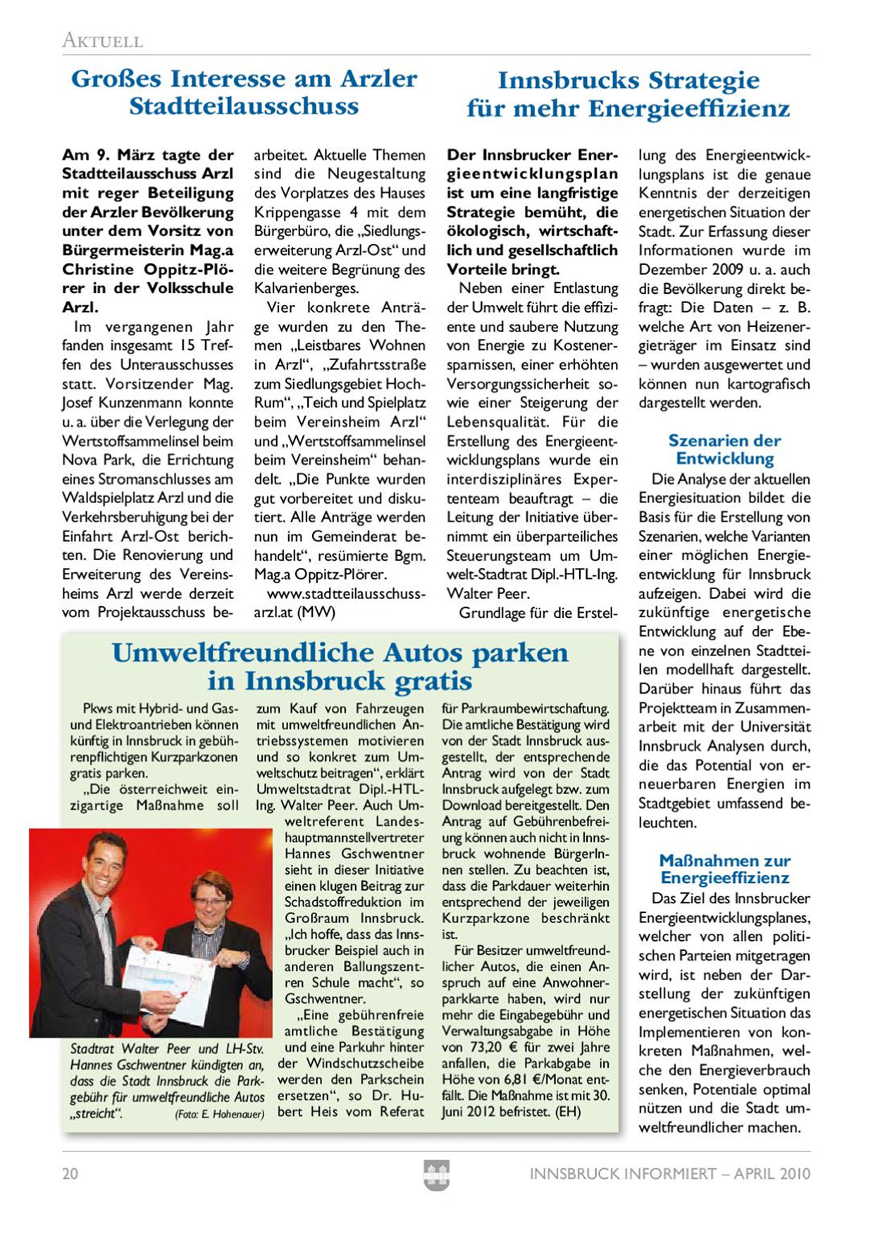 arbeitet. Aktuelle Themen sind die Neugestaltung des Vorplatzes des Hauses Krippengasse 4 mit dem Bürgerbüro, die „Siedlungserweiterung Arzl-Ost“ und die weitere Begrünung des Kalvarienberges.