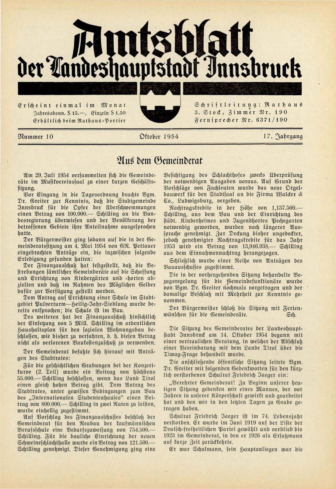 Die Sitzung des Gemeinderates der Landeshauptstadt Innsbruck am 14. Oktober 1954 begann mit