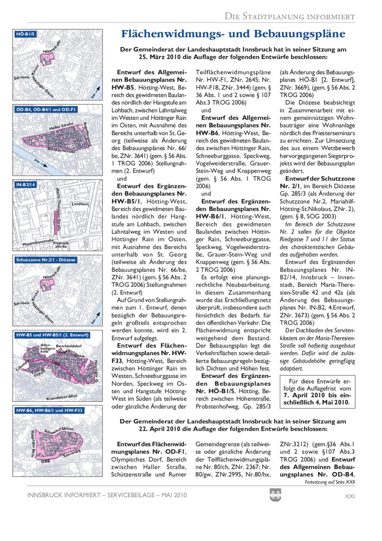Der Gemeinderat der Landeshauptstadt Innsbruck hat in seiner Sitzung am 22. April 2010 die Auflage der folgenden Entwürfe beschlossen: