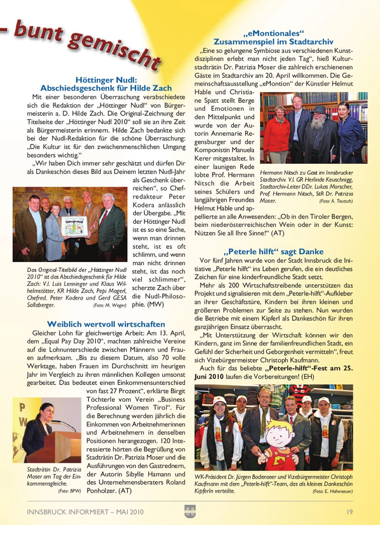 Mit einer besonderen Oberraschung verabschiedete sich die Redaktion der „Höttinger Nudl“ von Bürgermeisterin a. D. Hilde Zach. Die Original-Zeichnung der Titelseite der „Höttinger Nudl 2010“ soll sie an ihre Zeit als Bürgermeisterin erinnern. Hilde Zach