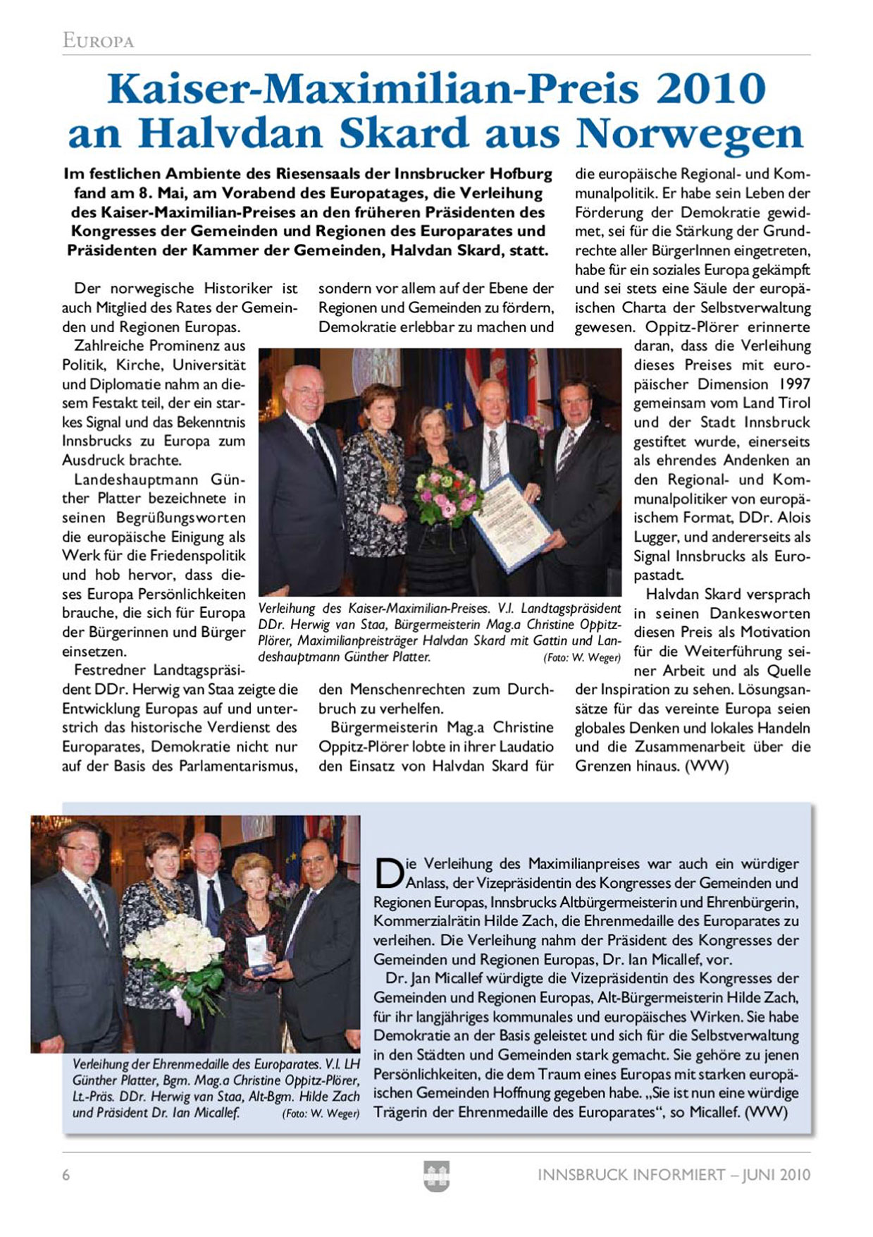 Im festlichen Ambiente des Riesensaals der Innsbrucker Hofburg fand am 8. Mai, am Vorabend des Europatages, die Verleihung des Kaiser-Maximilian-Preises an den früheren Präsidenten des Kongresses der Gemeinden und Regionen des Europarates und