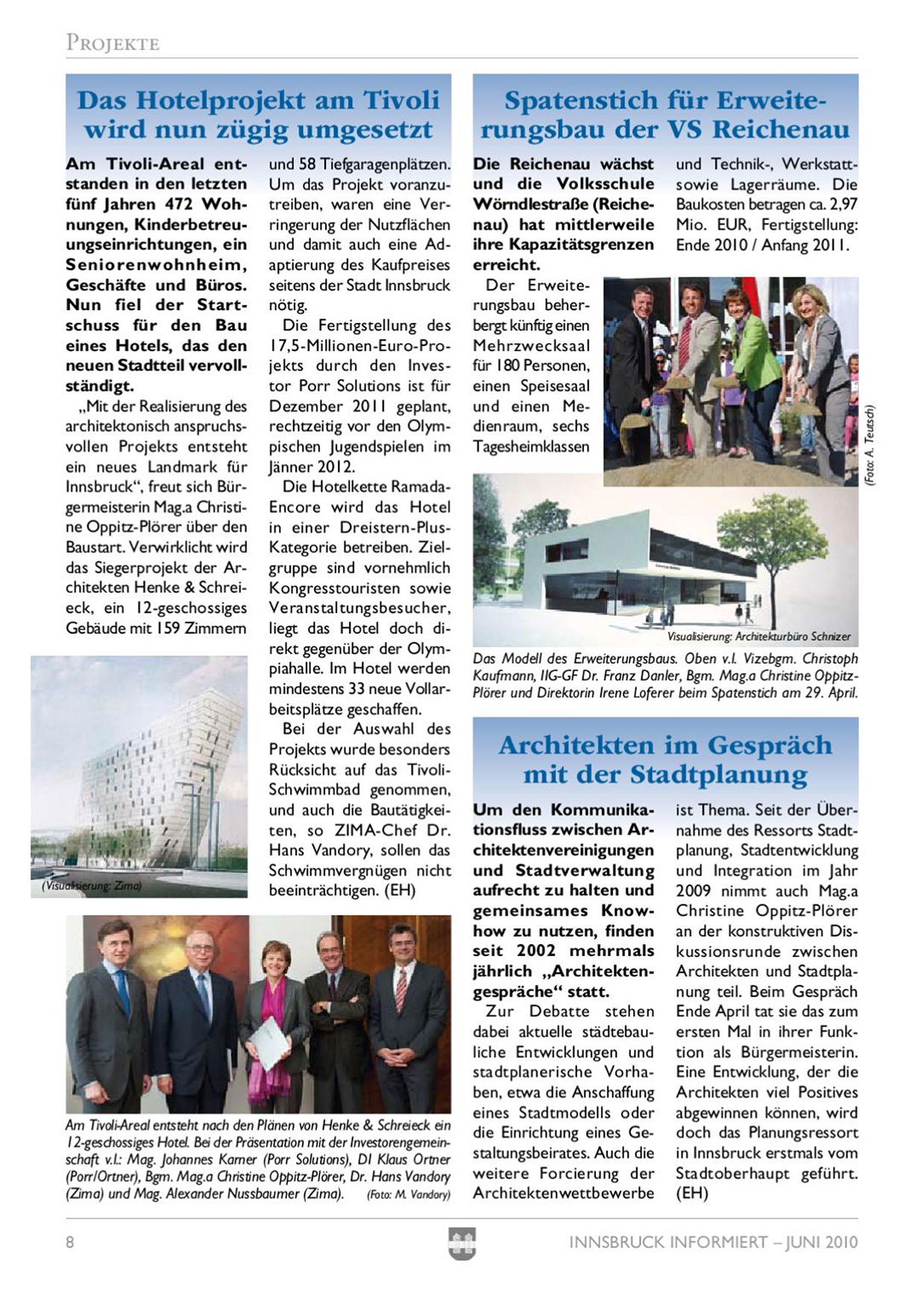 April tat sie das zum ersten Mal in ihrer Funktion als Bürgermeisterin. Eine Entwicklung, der die Archirekten viel Positives abgewinnen können, wird doch das Planungsressort in Innsbruck erstmals vom Stadtoberhaupt geführt. (EH)
