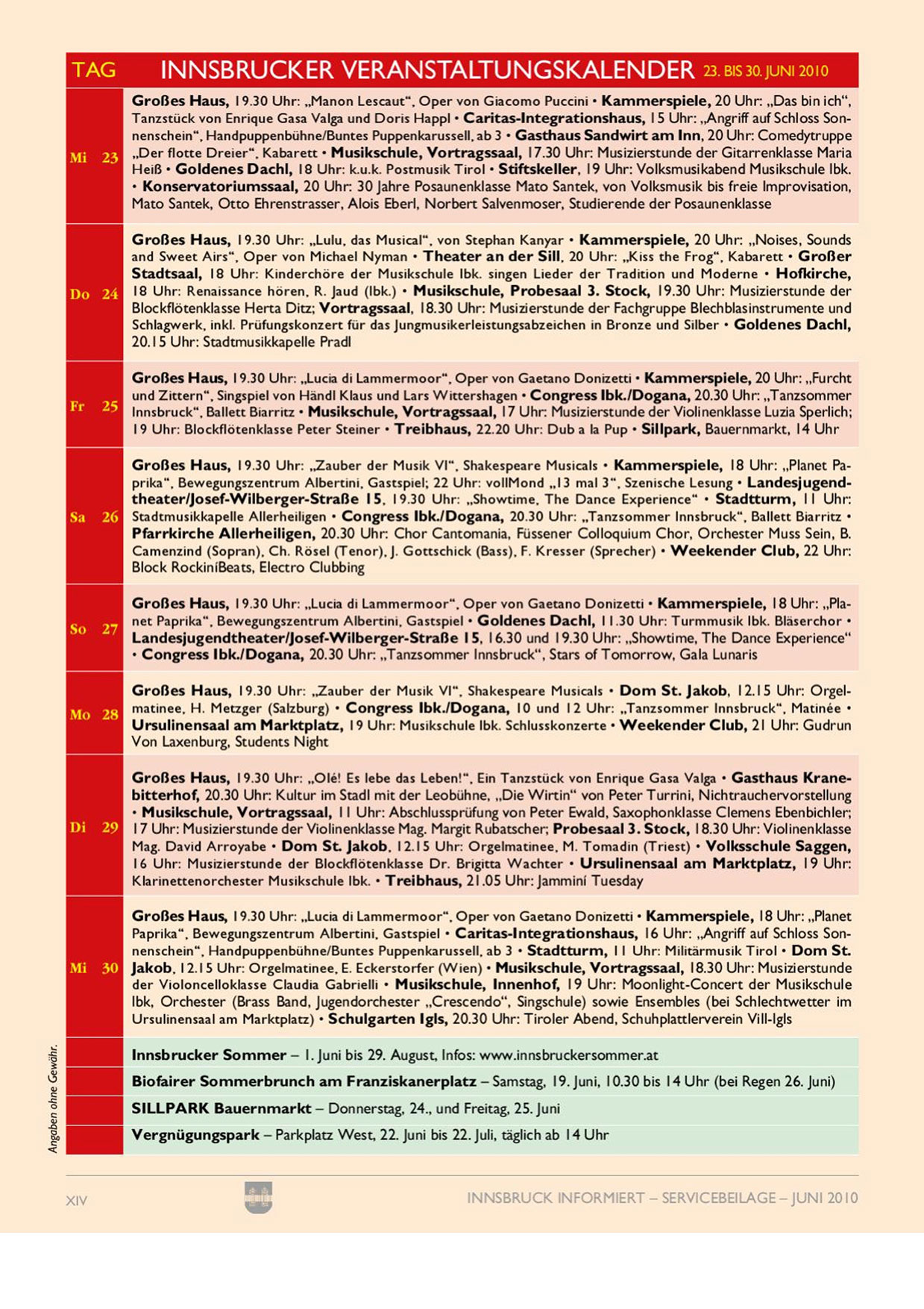 Großes Haus, 19.30 Uhr: „Lucia di Lammermoor“. Oper von Gaetano Donizetti- Kammerspiele, 18 Uhr: „Planet Paprika“, Bewegungszentrum Albertini. Gastspiel- Goldenes Dachl, 11.30 Uhr: Turmmusik lbk. Bläserchor LandesjugendtheaterJJosef-WilbergerStraße 15, 16.30 und 19.30 Uhr: „Showtime, The Dance Experience“ Congress lbk. /Dogana, 20.30 Uhr: „Tanzsommer Innsbruck“, Stars of Tomorrow, Gala Lunaris