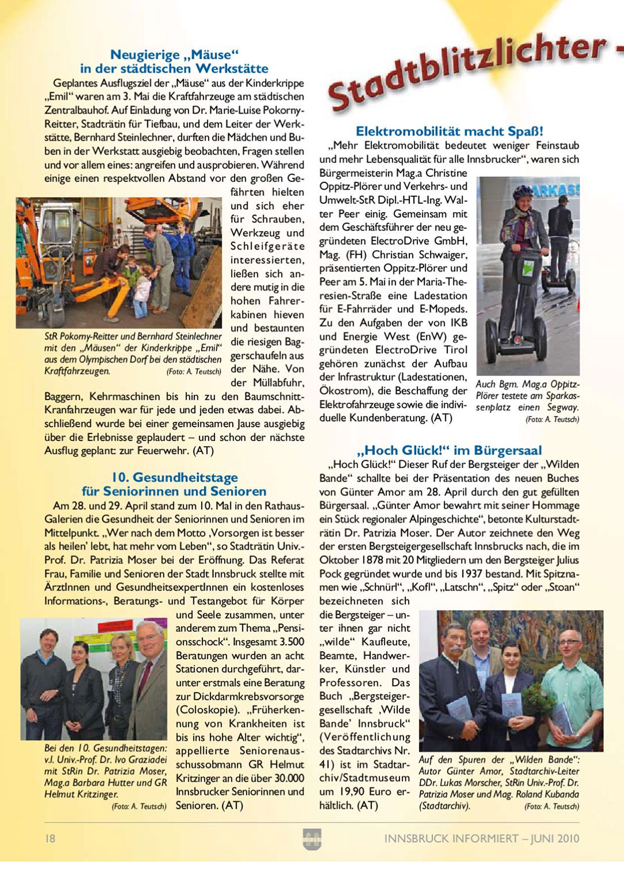 „Mehr Elektromobilität bedeutet weniger Feinstaub und mehr Lebensqualität für alle Innsbrucker“, waren sich Bürgermeisterin Mag.a Christine Oppitz-Plörer und Verkehrs- und Umwelt-StR Dipl.-HTL-Ing. Walter Peer einig. Gemeinsam mit dem Geschäftsführer