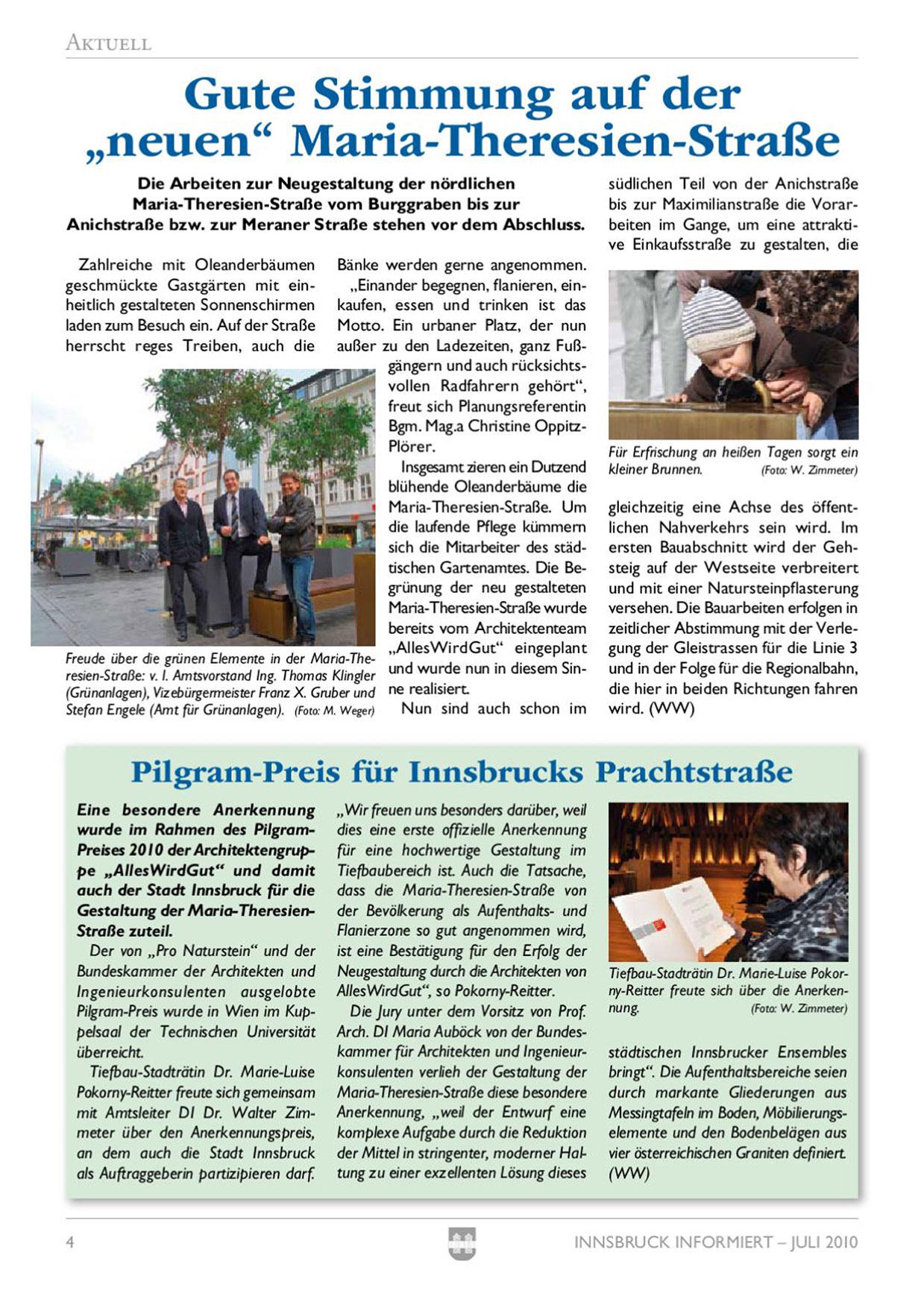 Eine besondere Anerkennung wurde im Rahmen des PilgramPreises 2010 der Architektengruppe „AllesWirdGut“ und damit auch der Stadt Innsbruck für die Gestaltung der Maria-TheresienStraße zuteil.