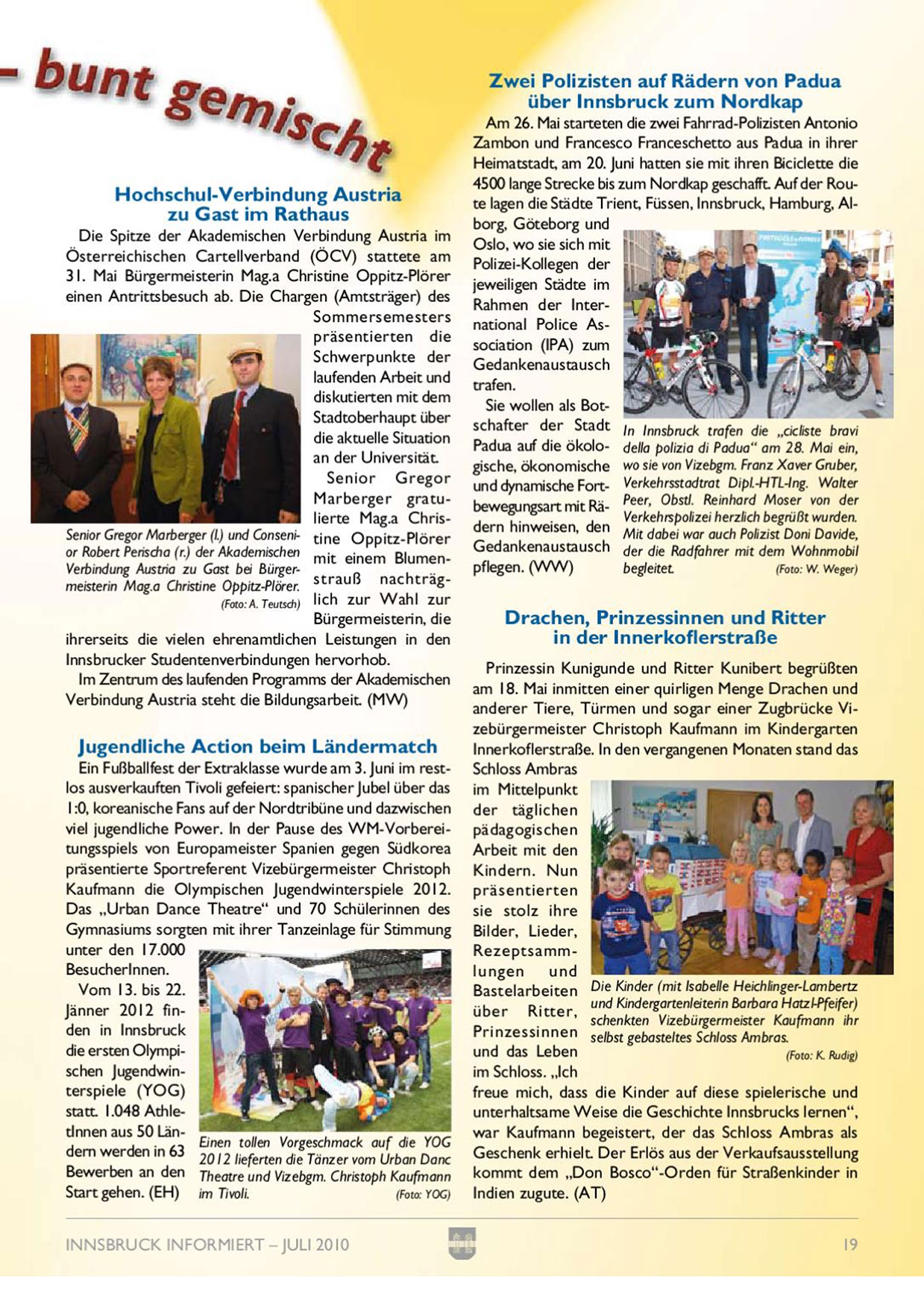 In Innsbruck trofen die „cichste bravi della polizio di Paduo“ am 28. Moi ein, wo sie von Vizebgm. Franz Xaver Gruber, Verkehrsstodtrat Dipl.-HTL-ng. Wolter Peer, Obstl. Reinhard Moser von der Verkehrspolzei herzich begrüßt wurden. Mit dobei wor auch