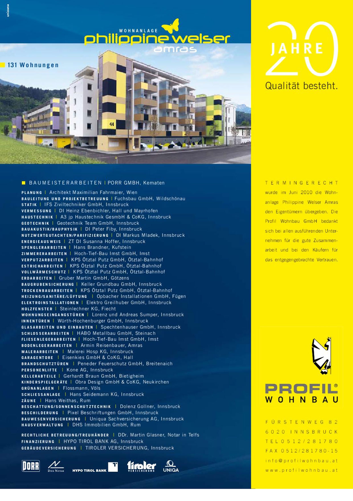 TERMINGERECHT wurde im Jumi 2010 die Wohnanlage Philippinie Weiser Amras den Eigentürern Obergeben. Die Profil Wohnbau EmbHl bedankt sich bei allen ausführenden Unternehmen für die gute Zusammenarbeit und bei den Käufern für das