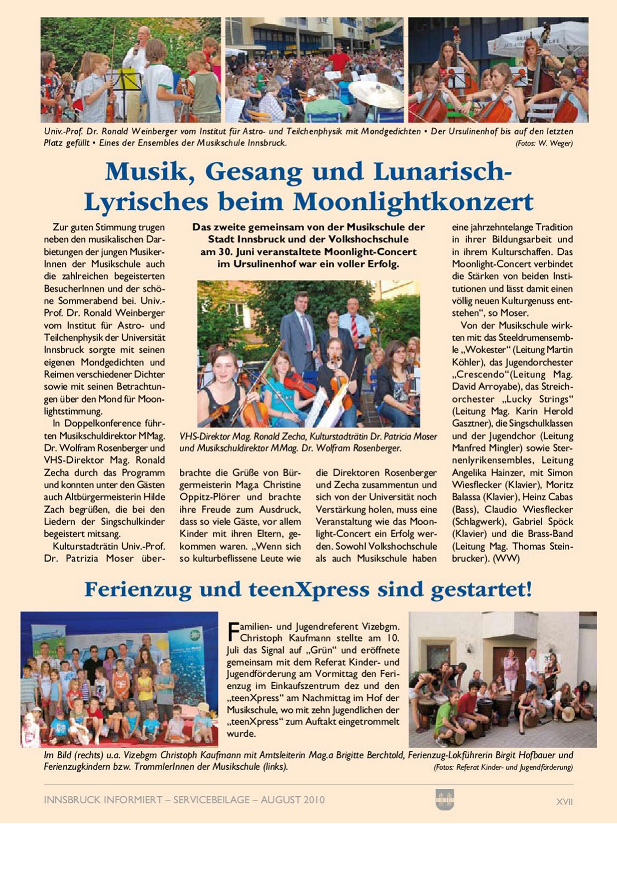 Zur guten Stimmung trugen neben den musikalischen Darbietungen der jungen MusikerInnen der Musikschule auch die zahlreichen begeisterten Besucherinnen und der schöne Sommerabend bei. Univ.Prof. Dr. Ronald Weinberger vom Institut für Astro- und Teilchenphysik der Universität Innsbruck sorgte mit seinen eigenen Mondgedichten und Reimen verschiedener Dichter sowie mit