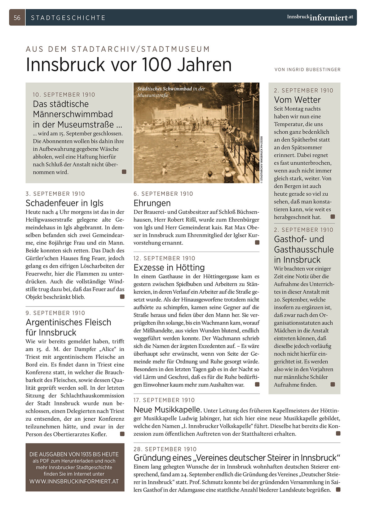 Einem lang gehegten Wunsche der in Innsbruck wohnhaften deutschen Steierer entsprechend, fand am 24. September endlich die Gründung des Vereines „Deutscher Steierer in Innsbruck“ statt. Prof. Schmutz konnte bei der gründenden Versammlung in Sailers Gasthof in der Adamgasse eine stattliche Anzahl biederer Landsleute begrüßen.