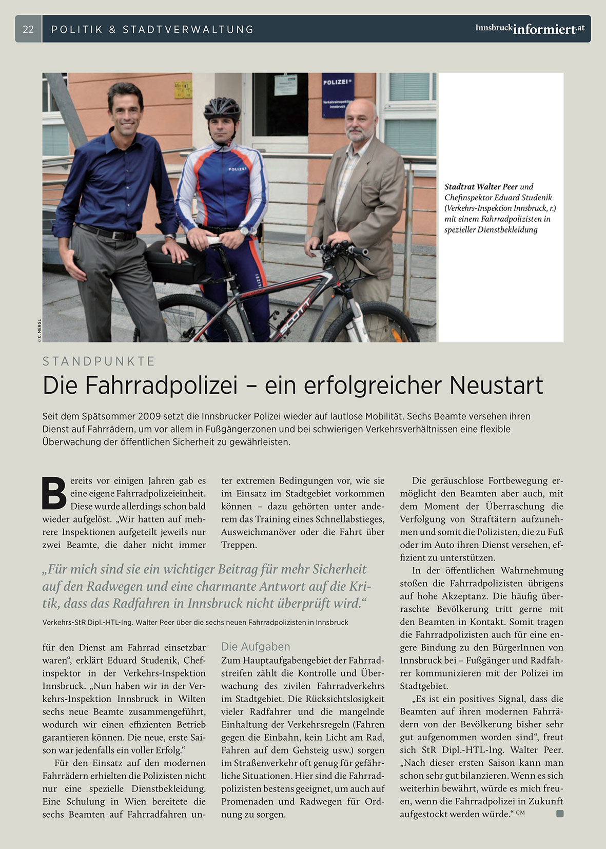 Verkehrs-StR Dipl.-HTL-Ing. Walter Peer über die sechs neuen Fahrradpolizisten in Innsbruck