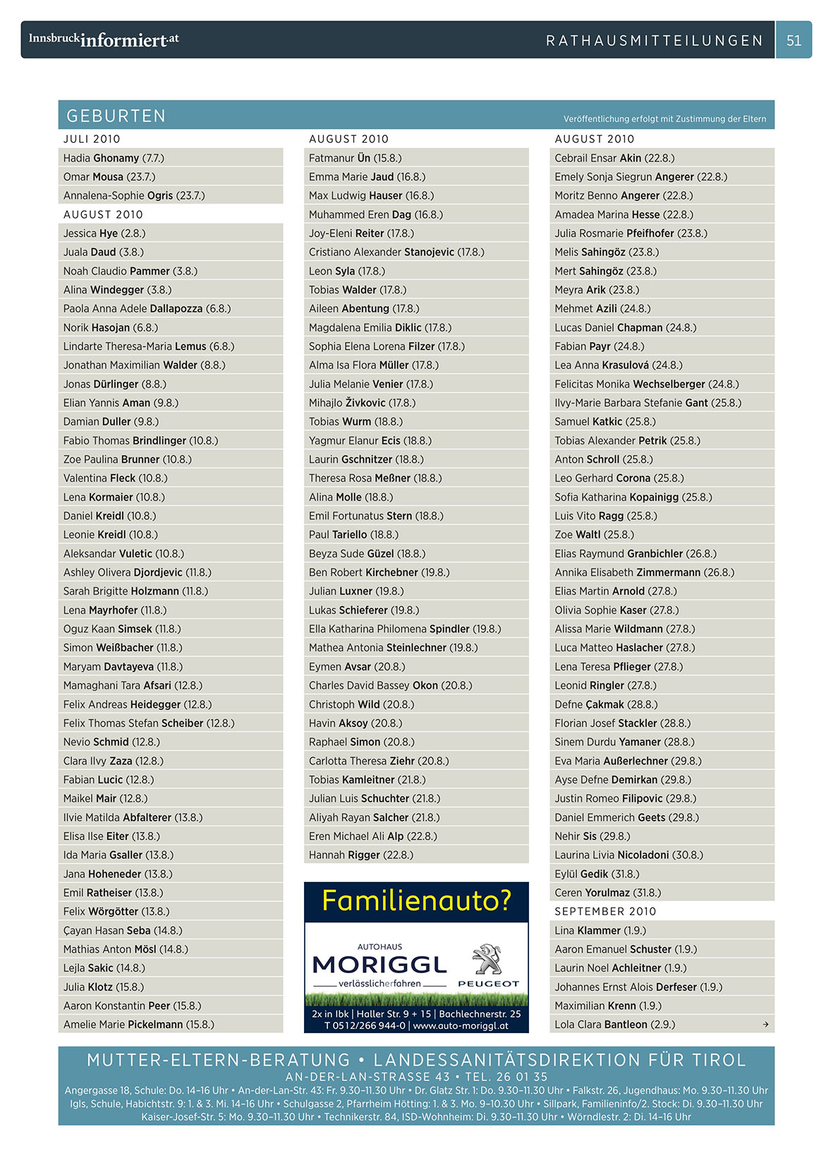 Igls, Schule, Habichtstr. 9: 1. & 3. Mi. 14–16 Uhr • Schulgasse 2, Pfarrheim Hötting: 1. & 3. Mo. 9–10.30 Uhr • Sillpark, Familieninfo/2. Stock: Di. 9.30–11.30 Uhr