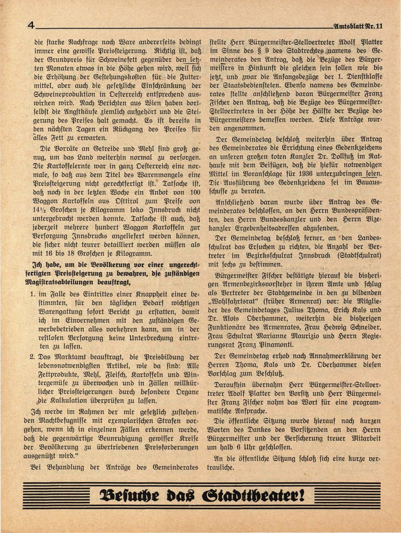 Der Gemeindetag beschloß ferner, an den Landesschulrat das Ersuchen zu richten, die Anzahl der Vertreter im Bezirksschulrat Innsbruck (Stadtschulrat)