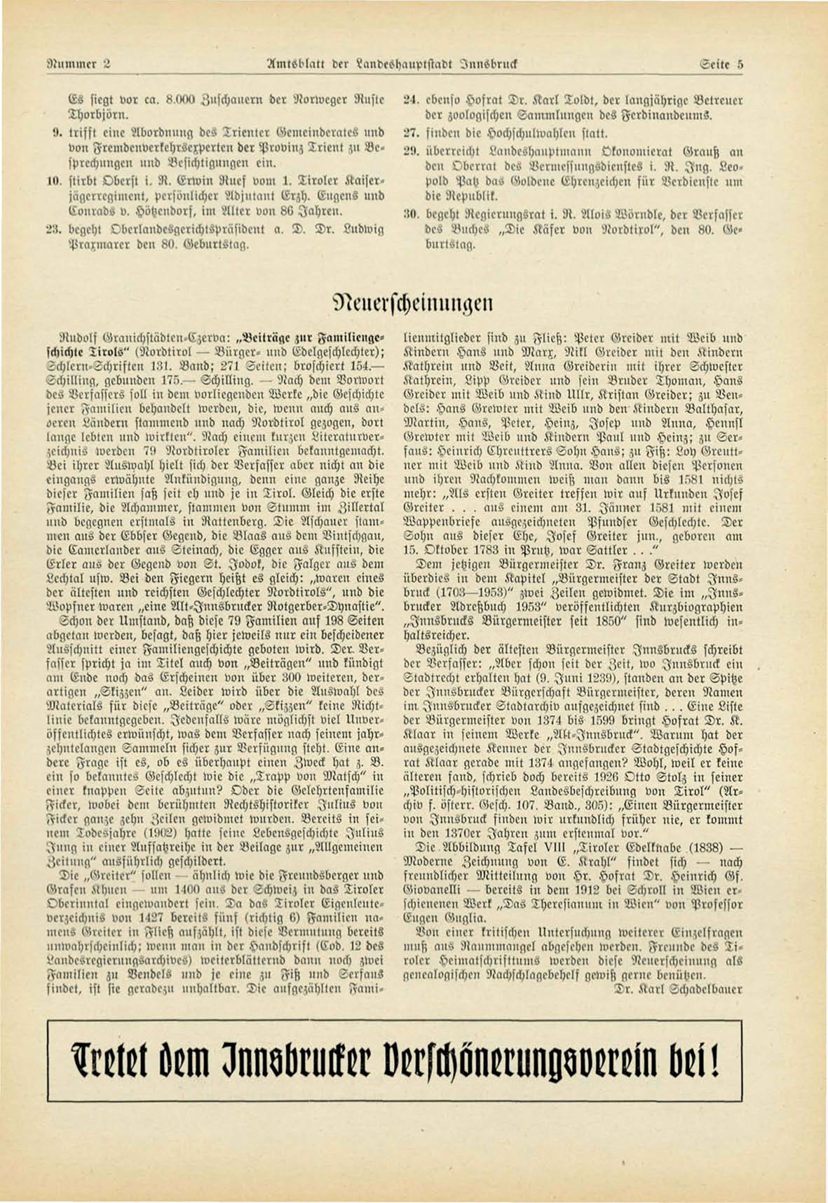 überdies i n dem Kapitel „Bürgermeister der Stadt I n n s bruck (1703—1953)" zwei Zeilen gewidmet. Die im „ I n n s brucker Adreßbuch 1953" veröffentlichten Knrzbiographien