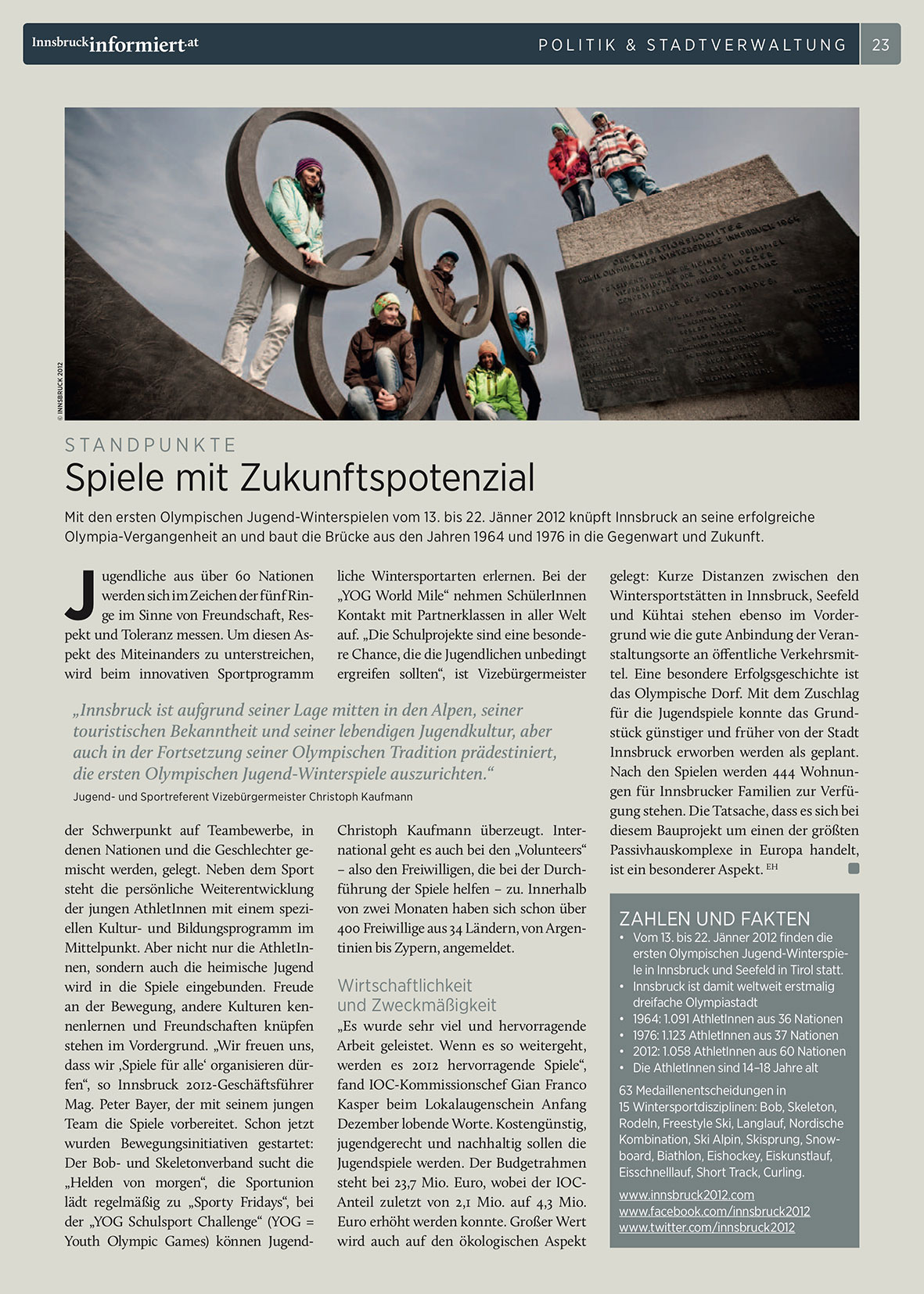 Mit den ersten Olympischen Jugend-Winterspielen vom 13. bis 22. Jänner 2012 knüpft Innsbruck an seine erfolgreiche