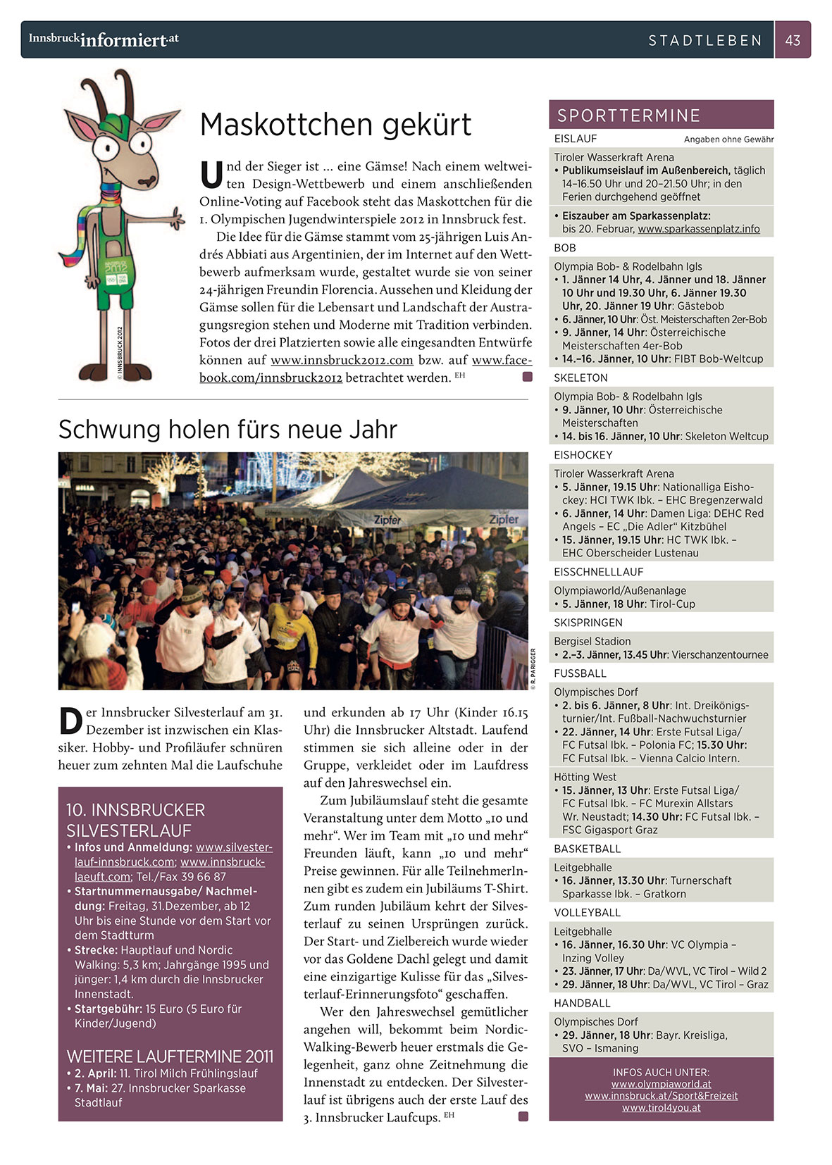• Infos und Anmeldung: www.silvesterlauf-innsbruck.com; www.innsbrucklaeuft.com; Tel./Fax 39 66 87
