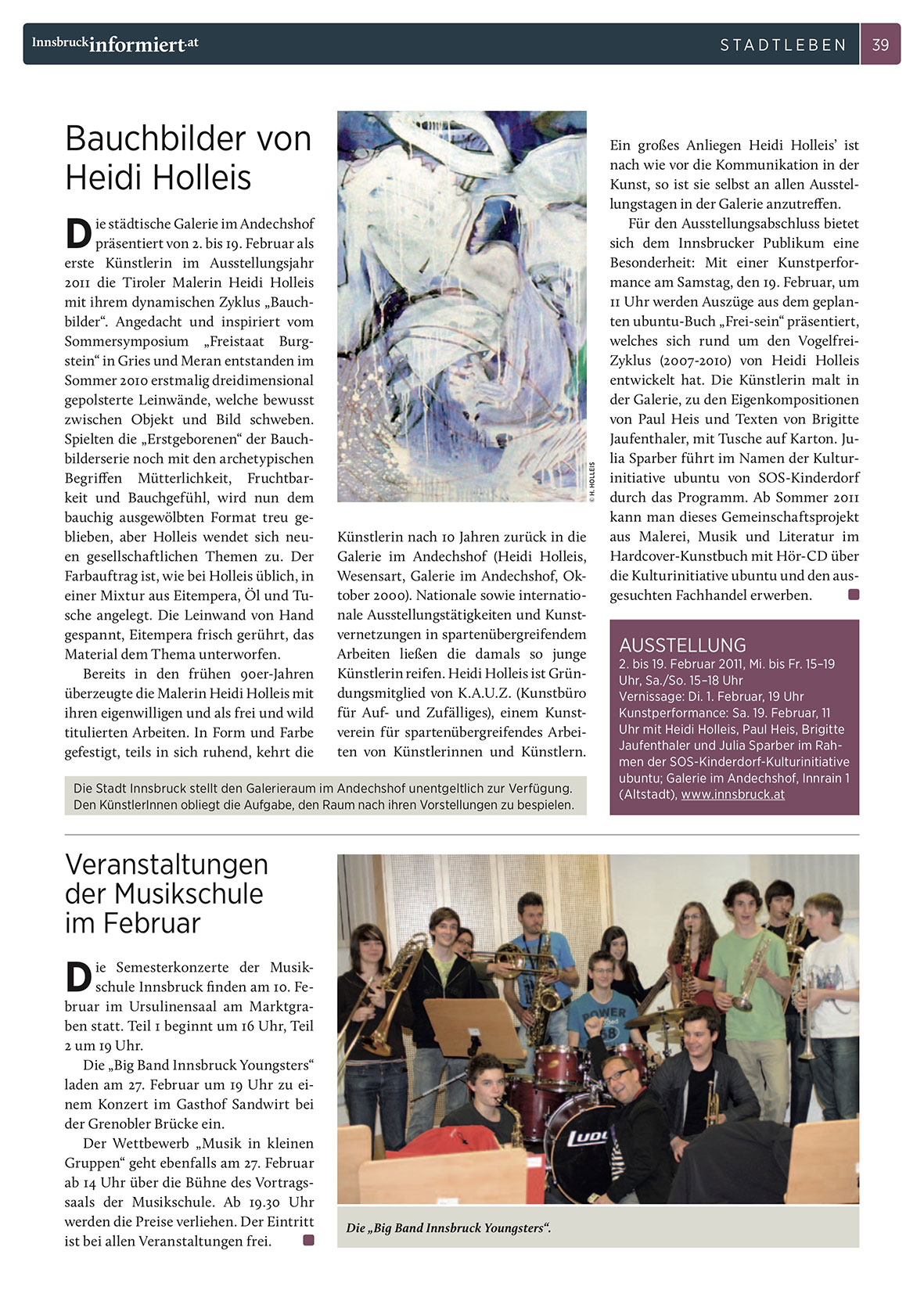 ie Semesterkonzerte der Musikschule Innsbruck finden am 10. Februar im Ursulinensaal am Marktgraben statt. Teil 1 beginnt um 16 Uhr, Teil