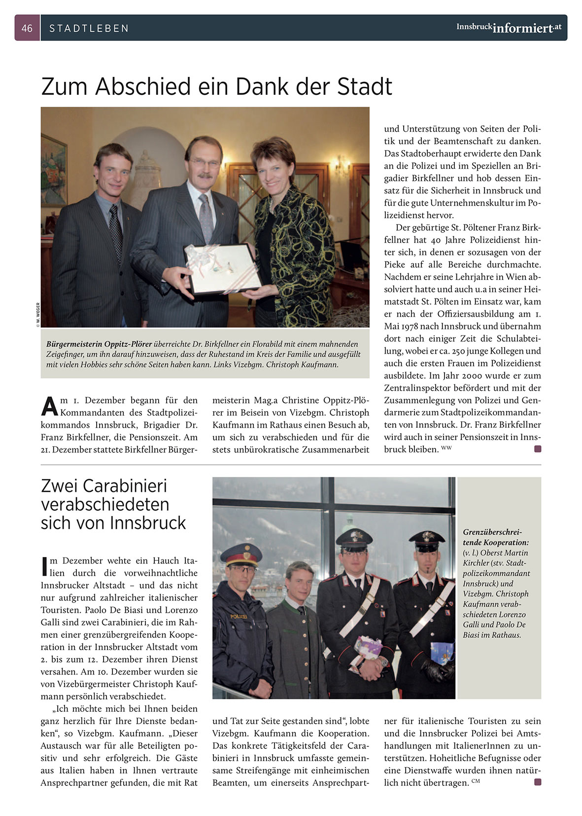 an die Polizei und im Speziellen an Brigadier Birkfellner und hob dessen Einsatz für die Sicherheit in Innsbruck und