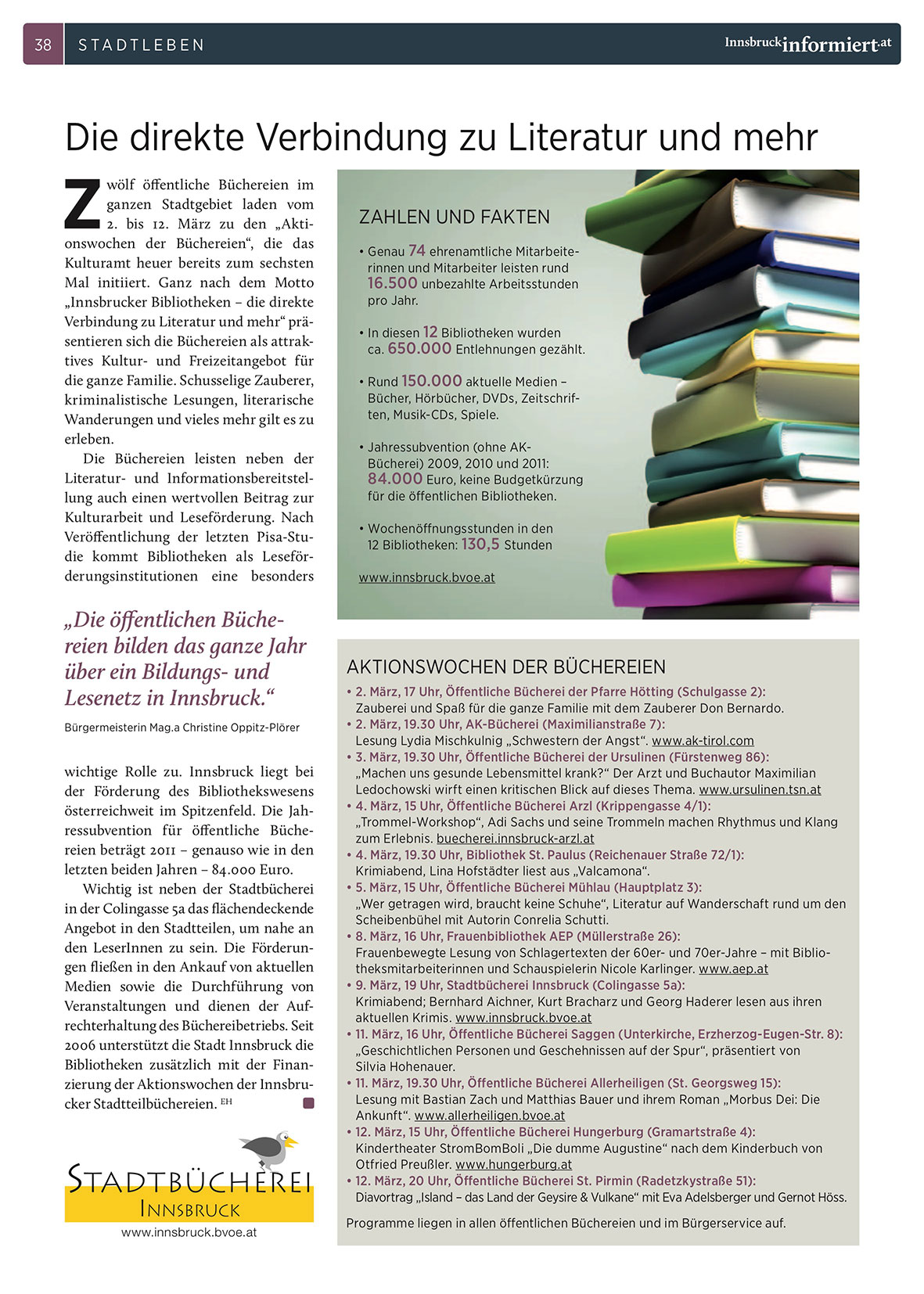 Bibliotheken zusätzlich mit der Finanzierung der Aktionswochen der Innsbrucker Stadtteilbüchereien. EH