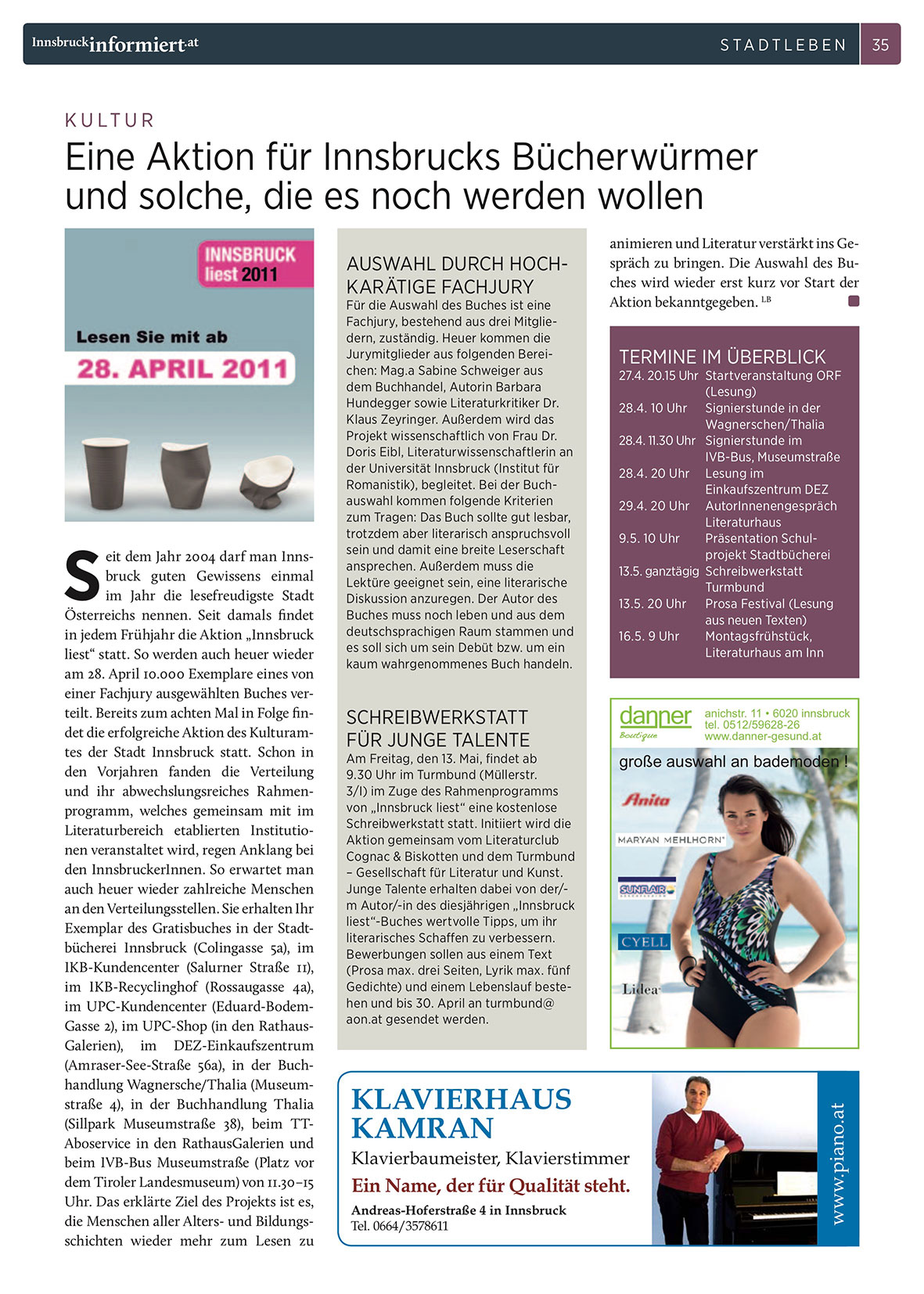 einer Fachjury ausgewählten Buches verteilt. Bereits zum achten Mal in Folge findet die erfolgreiche Aktion des Kulturamtes der Stadt Innsbruck statt. Schon in