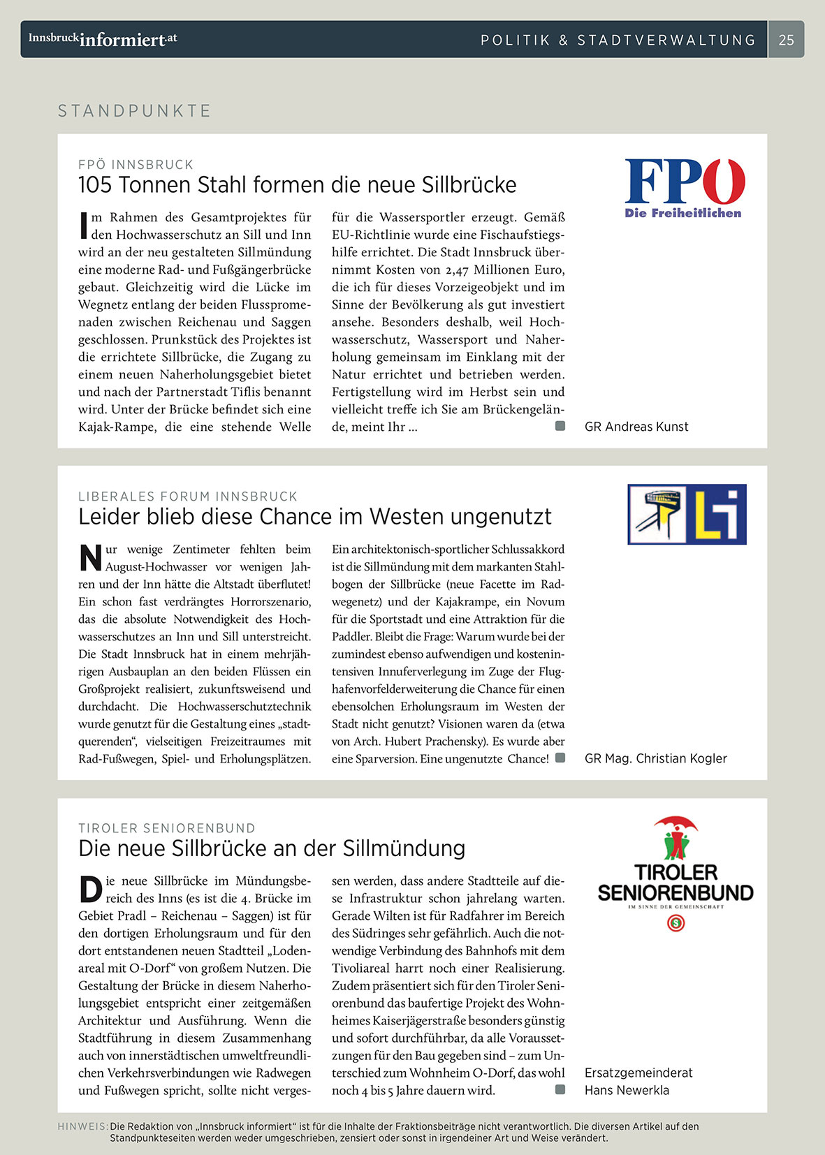 H I N W E I S : Die Redaktion von „Innsbruck informiert“ ist für die Inhalte der Fraktionsbeiträge nicht verantwortlich. Die diversen Artikel auf den