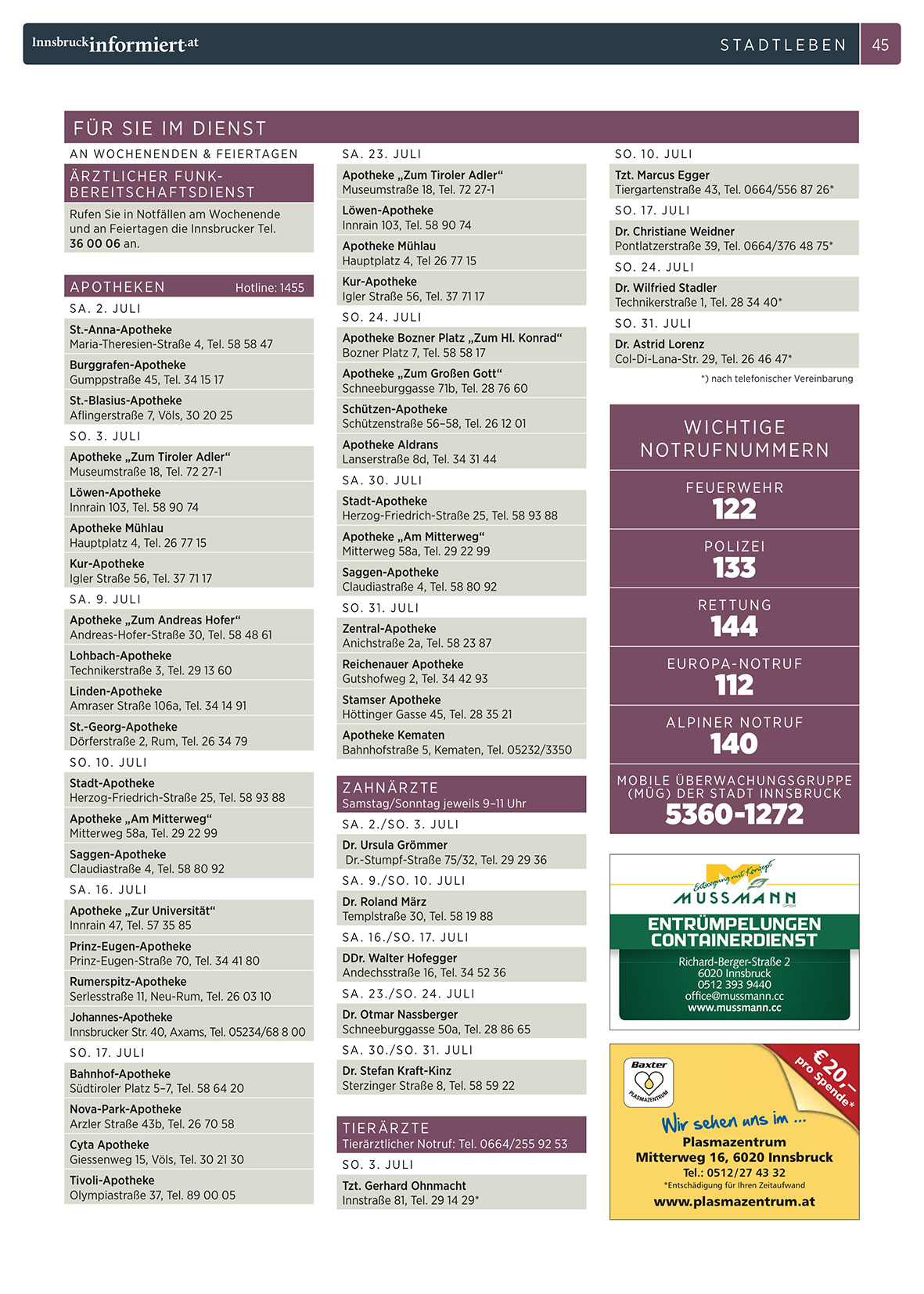 und an Feiertagen die Innsbrucker Tel.