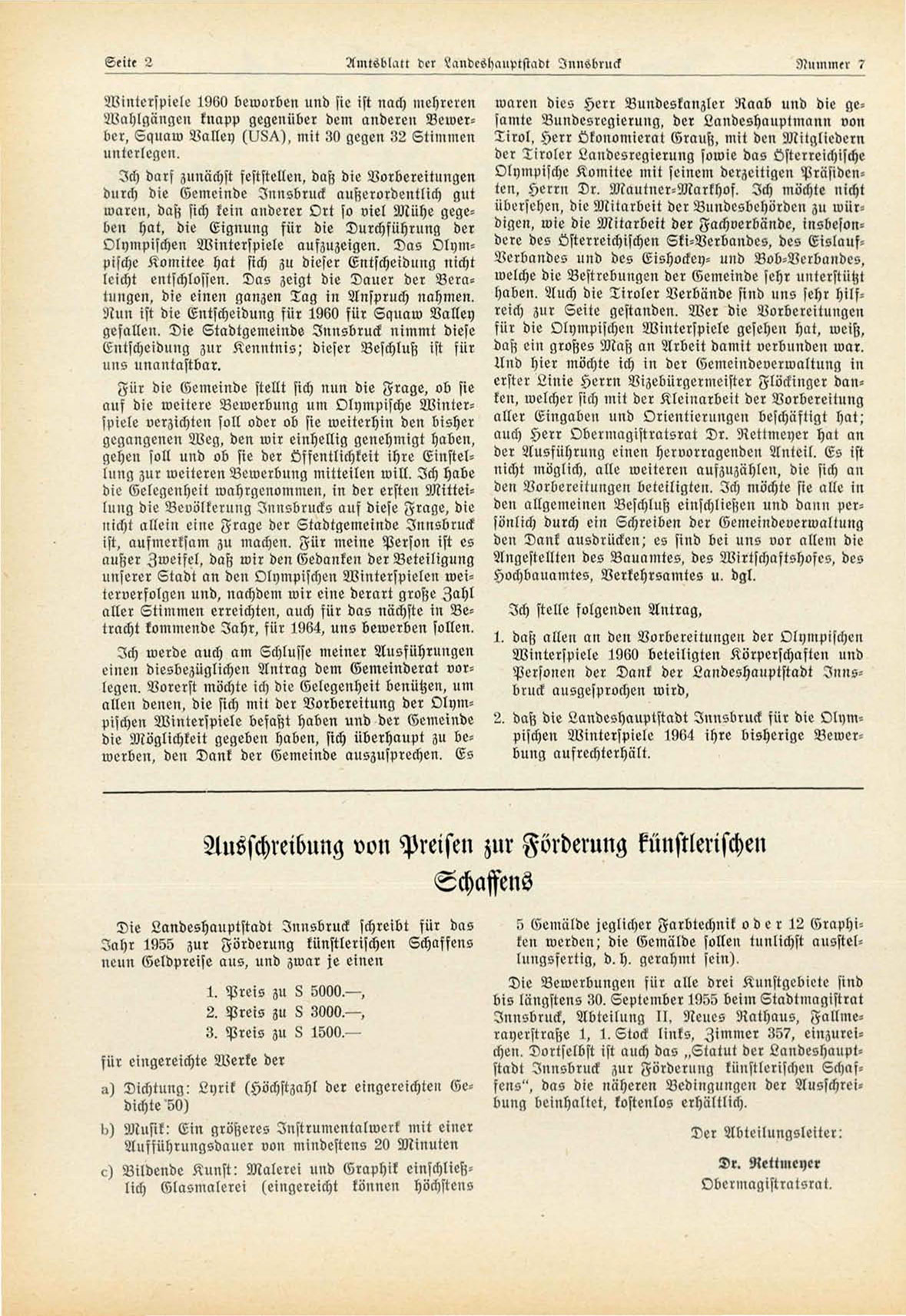 2. daß die Landeshauptstadt Innsbruck für die Olympischen Winterspiele 1964 ihre bisherige Bewerbung aufrechterhält.