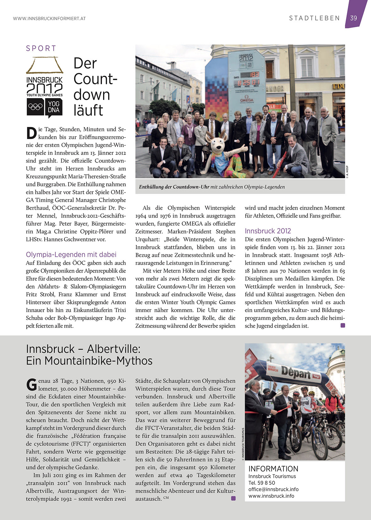 ie Tage, Stunden, Minuten und Sekunden bis zur Eröffnungszeremonie der ersten Olympischen Jugend-Winterspiele in Innsbruck am 13. Jänner 2012