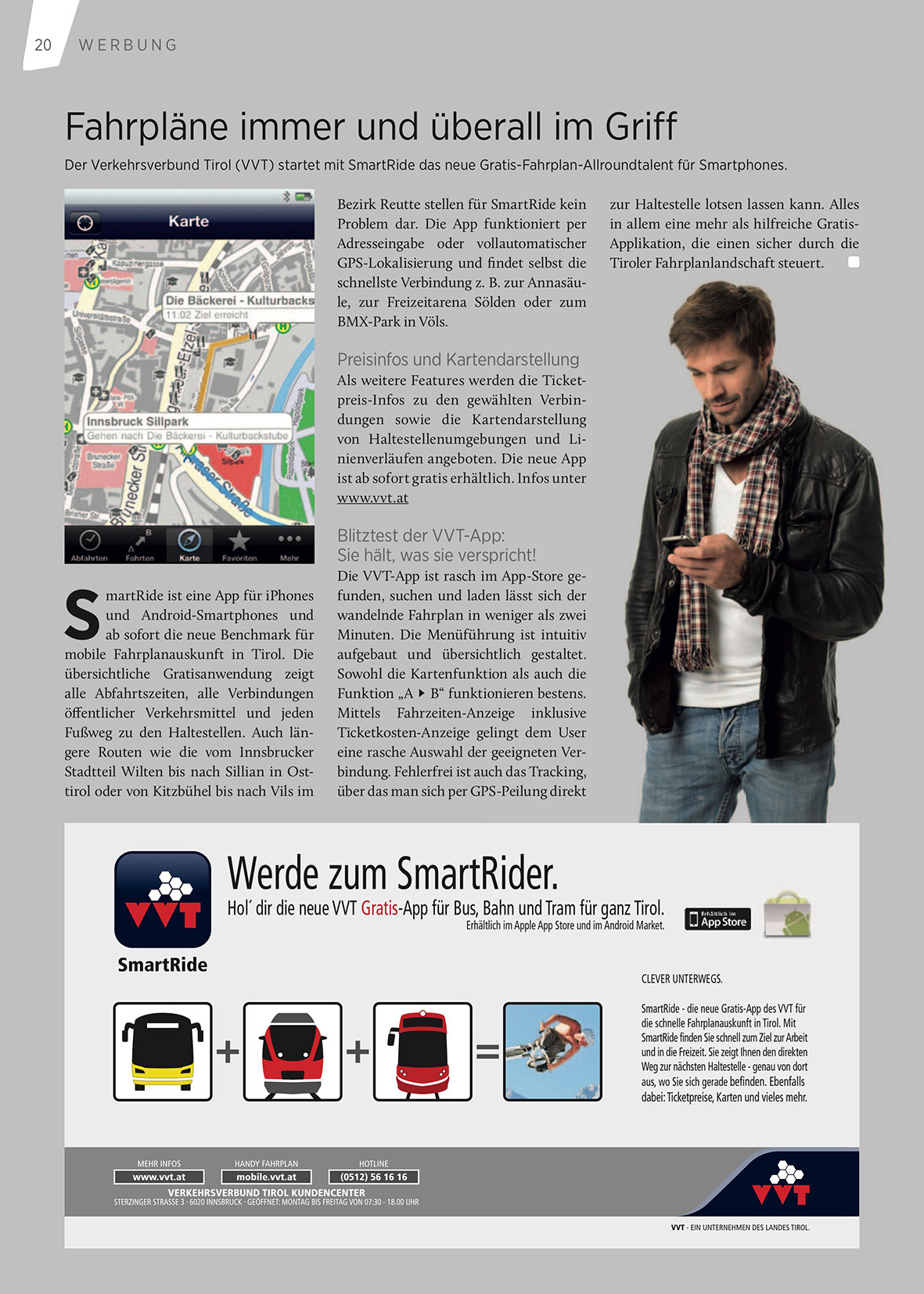 der verkehrsverbund tirol (vvt) startet mit smartride das neue gratis-fahrplan-Allroundtalent für smartphones.
